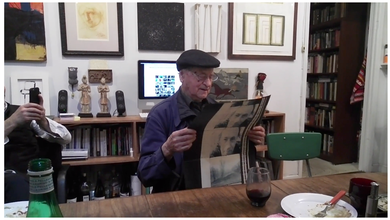 JR、ルイ・ガレル、1人の女性、息子のセバスチャンと5人でお茶をするメカス。『NY映画祭』に『顔たち、ところどころ』を観に行くところだという。テーブルにはかつてメカスが『ムービー・ジャーナル』を連載した『ヴィレッジ・ヴォイス』誌の、プリント版としての最終号が置かれている。ひと世代下のアーティストたちがコーヒーを飲む中、メカスは昼から赤ワイン。ガレルに尋ねられ、ゴダールに一度だけ会ったことを語る。『カイエ・デュ・シネマ』にゴダールが『営倉』のグッドレビューを書いてくれたのだと。『顔たち、ところどころ』でJRと共にゴダールを訪ねたアニエス・ヴァルダもビデオ通話で登場する、なんとも楽しげな昼下がり。