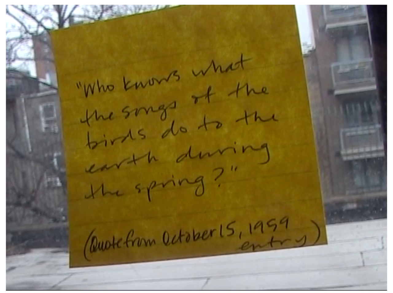 窓に貼られた黄色い付箋にひとつのフレーズが記されている。”Who knows what the songs of the birds do to the earth during the spring?” (春のあいだ、鳥たちの歌が地球に何をもたらすかを誰が知っているというのだろう)。1959年の10月に書かれた一文をただただ映すシンプルな春の映像詩。