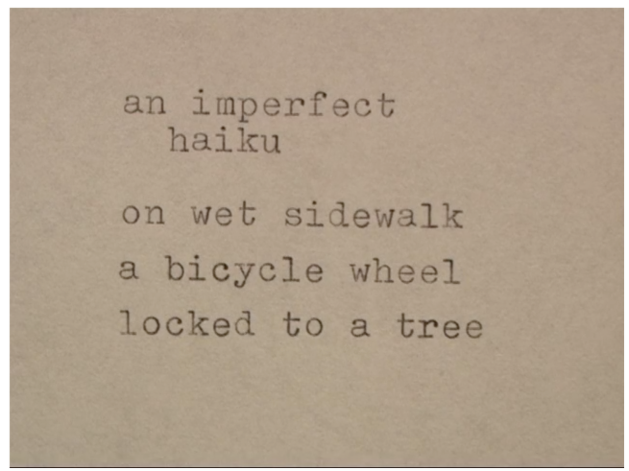 「an imperfect haiku」として、メカスの俳句が映し出されるだけのシンプルな映像。ここで記されたフレーズ(on wet sidewalk a lonely bicycle wheel locked to a tree)は、前述したセント・マークス教会での朗読(2016年)の中にも登場する。こういった場合、俳句がいくつか連なって詩がつくられているのか、詩の一節が俳句として切り出されているのか、はたまたそのどちらでもないのか、映像からは判別しきれないけれど興味深い。「an imperfect haiku」だけが映される映像は2014年10月にもアップロードされている。