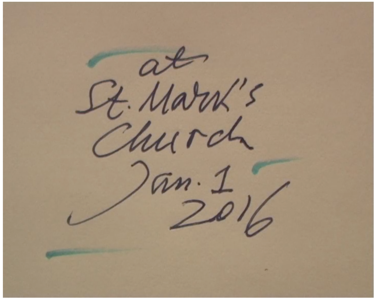 メカスは2014年から2018年まで、5年連続でセント・マークス教会での新年イベントの動画を自身のウェブサイトにアップロードしている(現在は視聴できないものの2012年に動画をあげようとした跡も。2011年は誰かがあげたYoutube動画をサイトに埋め込んでいる)。なかでも興味深かったのが、2016年の映像。シンプルにスピーチの様子を撮影しただけの他の動画と違い、冒頭と末尾に夜タクシーから見える車窓と、自作の詩を手書きした画面が映し出される。以下は、その詩を写したものと意訳。
