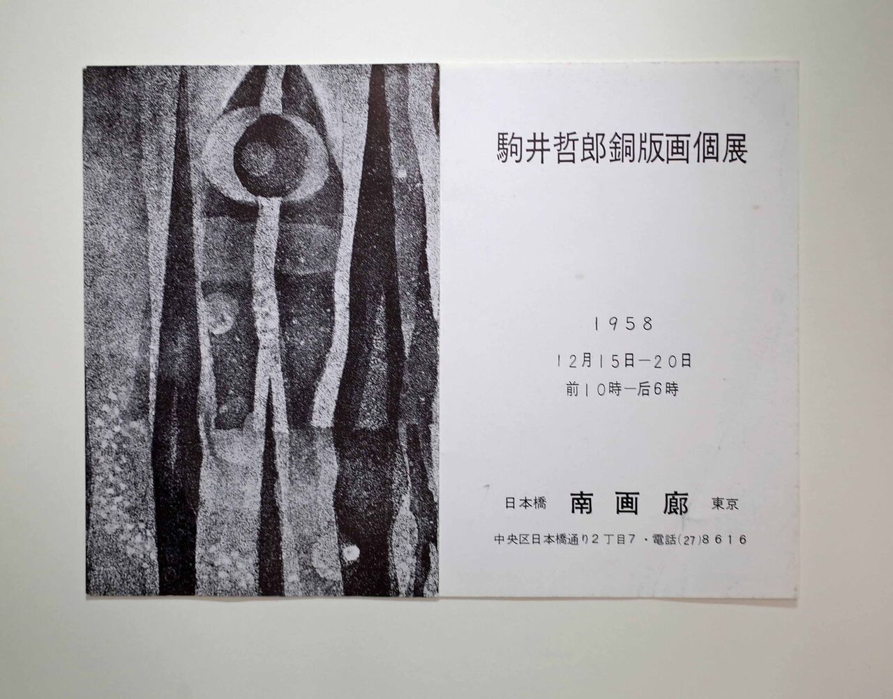 個展の翌54年から1年9カ月の間、駒井はフランスに留学した(54年3月21日横浜港発、55年12月24日横浜港着)。パリから出した瀧口宛て54年8月7日付け葉書(慶應義塾大学アート・センター蔵。参考文献5所載。)には、「フランスでは仕事は出来さうにありませんので、大いに見学したり遊んだりする積りです」と記され、実際、道具類も日本から持参しなかったらしい。といっても、文献3の座談会のなかで「ヨーロッパには銅版画の伝統があるでしょうが、それについてほとんどわからないから、僕は、自分勝手にやっているつもりなんですけども、自然にむこうの伝統に沿うようにはしたい。多少むこうの本物といわれるものに、質の上で近づきたいと思いますね」と述べているとおり、ヨーロッパの銅版画の伝統的な技術の習得は、駒井の年来の望みだったのだから、留学の目的のなかでも重要なひとつだったのは確かと思われる。