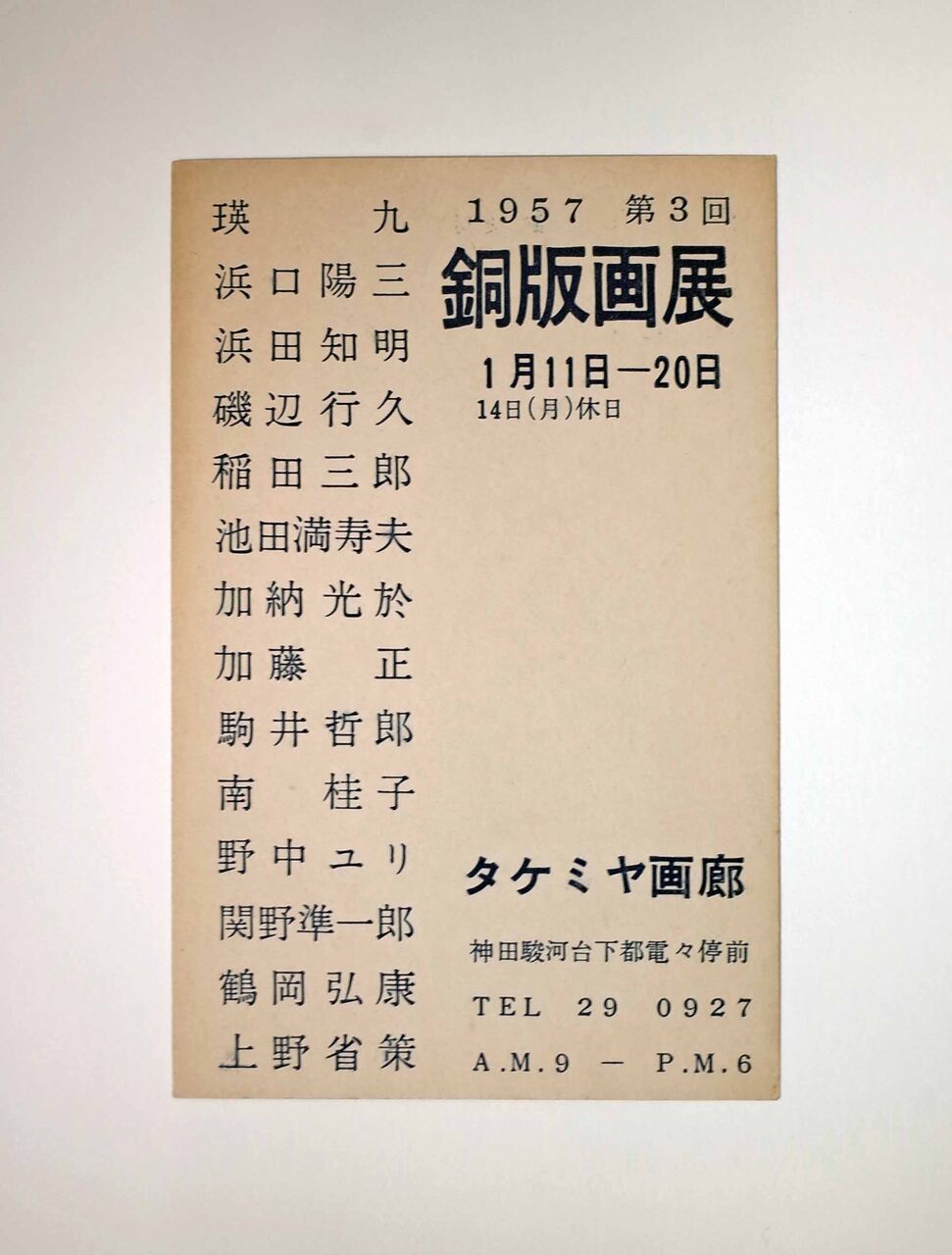 図30この銅版画論が発表される直前の55年1月4日~10日に、瀧口はタケミヤ画廊で「銅版画6人展」(図31)を開催しているが、この6人の銅版画家は「みづゑ」誌に「作家の言葉」を寄せていた6人である。つまり「銅版画の復活」は、タケミヤ画廊での銅版画グループ展と密接に関連しており、いわば同展の開催宣言ないし報告でもあったといえるだろう。同画廊ではこれ以降、幕を下ろす57年まで、銅版画グループ展を毎年年初に開催するのが恒例となった。駒井はフランス留学中(54年3月~55年12月)だった55年の「銅版画6人展」には出品していないが、帰国直後の第2回展(56年1月4日~10日。図32)、翌年の第3回展(57年1月11日~20日。図33)には参加している。その後、新橋の画廊ひろしに会場を移し、第4回展(58年1月10日~19日)が開催された。駒井も出品している。