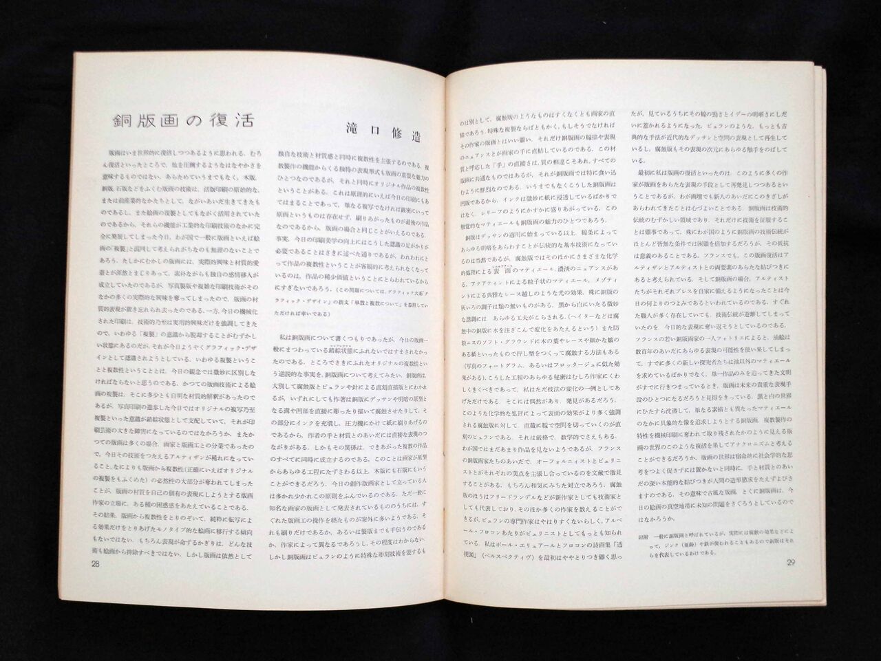 版画はいま世界的に復活しつつあるように思われる。むろん復活といったところで、他を圧倒するようなはなやかさを意味するものではない。あらためていうまでもなく、木版、銅版、石版などをふくむ版画の技術は、活版印刷の原始的な、または前産業的なかたちとして、ながいあいだ生きてきたものであるし、また絵画の複製としてもながく活用されていたのであるから、それらの機能が工業的な印刷技術のなかに完全に発展してしまった今日、わが国で一般に版画といえば絵画の「複製」と混同して考えられがちなのも無理のないことであろう。たしかにむかしの版画には、実際的興味と材質的愛着とが渾然とまじりあって、素朴ながらも独自の感情移入が成立していたのであるが、写真製版や複雑な印刷技術がそのなかの多くの実際的な興味を奪ってしまったので、版画の材質的表現が置き忘れられ去ったのである。一方、今日の機械化された印刷は、技術的ないしは実用的興味だけを強調してきたので、いわゆる「複製」の意識から脱却することがむずかしい状態にあるのだが、それが今日ようやくグラフィック・デザインとして認識されようとしている。いわゆる複製ということと複数性ということとは、今日の観念では微妙に区別しなければならないと思うのである。かつての版画技術による絵画の複製は、そこに多少とも自明な材質的解釈があったのであるが、写真印刷の進歩した今日ではオリジナルの複写ないし複製といった意識が錯綜状態として支配していて、それが印刷芸術の大きな障害になっているのではなかろうか。またかつての版画は多くの場合、画家と版画工との分業であったので、今日その技術をつたえるアルティザンが稀れになっていること、なによりも版画から複数性(正確にいえばオリジナルの複製をもふくめた)の必然性の大部分が奪われてしまったことが、版画の材質を自己の固有の表現にしようとする版画作家の立場に、ある種の困惑感をあたえていることである。その結果、版画から複数性をとりのぞいて、純粋に転写による効果だけをとりあげたモノタイプ的な絵画に移行する傾向もないではない。もちろん表現が命ずるかぎりは、どんな技術も絵画から排除すべきではない。しかし版画は依然として、独自な技術と材質感と同時に複数性を主張するのである。複数製作の機能からくる独特の表現形式も版画の重要な魅力のひとつなのであるが、それと同時にオリジナル作品の複数性ということがある。これは原理的にいえば今日の印刷にもあてはまることであって、単なる複写でなければ厳密にいって原画というものは存在せず、刷りあがったものが最後の作品なのであるから、版画の場合と同じことがいえるのである。事実、今日の印刷美学の向上にはこうした認識の足がかりが必要であることはさきに述べた通りであるが、われわれにとって作品の複数性ということが客観的に考えられなくなっているのは、作品の稀少価値ということにとらわれているからにすぎないであろう。(この問題については、グラフィック大系グラフィック・デザイン」の拙文「単数と複数について」を参照していただければ幸いである)