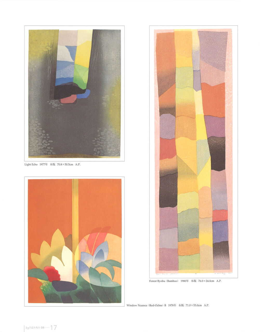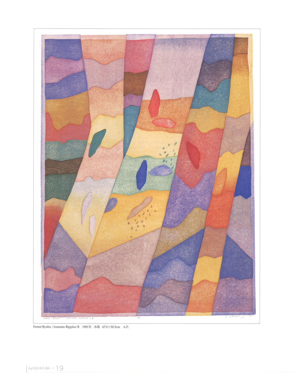 《Forest Byobu(Twilight Weave)A》(1981年)の、画家のいう「色面織り」の前にもう一度佇んでみる。江戸以来の木版画の技法、とりわけ微妙なボカシの技法によって、穏やかな水彩絵具の色彩が、浅い空間のなかに浮遊するかのように揺らいでいる。薄く紗がかかっているような、森の水気の感覚が、深く息づく。視覚も、触覚も、まるで無駄な力を抜かれ、やさしく揉み解されたように、心底くつろいでしまう。自由、というものはこういうものかもしれない、とふと思う。しかし、この極上の版の音律も、おそらく誰にもまして厳しい条件下で執拗に追及された果てに、生まれ出たものであることも忘れてはならないだろう。そこに辿り着くまでの軌跡そのものもまた、この稀なる版画家が僕たちに残してくれたかけがえのない表現行為なのである。