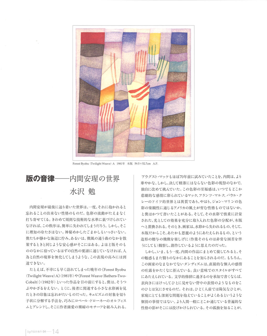 内間安瑆が最後に辿り着いた世界は、一度、それに抱かれると忘れることの出来ない性格のものだ。色彩の波動がたえまなく打ち寄せてくる。きわめて周到な技術的な水準に裏づけられていなければ、この秩序は、簡単に失われてしまうだろう。しかし、そこに理知の冷たさはない。神秘めかしたごまかしもいっさいない。僕たちが静かな海辺に佇み、あるいは、微風の通う森のなかを散策するときと同じような安心感がそこにはある。よほど版そのもののなかに宿っているはずの自然の要諦に通じていなければ、人為と自然の境界を無化してしまうような、この表現の高みには到達できない。
