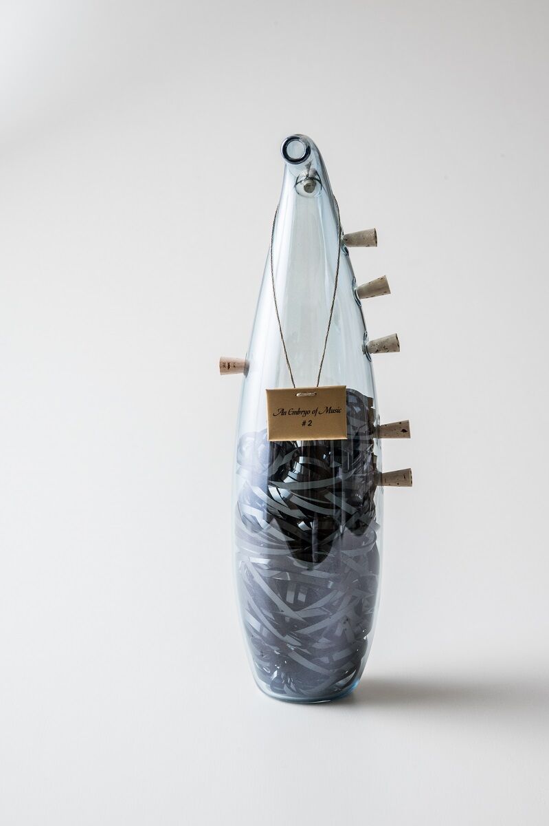 1995年、ボノットからこんな手紙が来ました。「近所の友人に優秀なガラス職人がいて、皆さんにグラッパ(葡萄酒を蒸留して作るイタリー特産のブランデー)を入れるボトルのデザインを考えて貰って、エディションを出しているのですが、参加しませんか」というのです。既に作成されたベン・パターソンやエメット・ウィリアムズの造形的に面白い瓶の写真も添えてありました。エディションとしては全部で12個作り、作家には4個を提供するとのことでした。そこで先ず、瓶は中が空洞になっていることから、楽器のイメージが浮かびました。そして弦楽器でも管楽器でもない、楽器としては未分化な、いわば楽器の胎児のような形の瓶を作ってみたいと思ったのです。それには二つのヴァージョンを考えました。一つは本物のグラッパ用、もう一つには何かの形で音楽を入れたいと思いました。