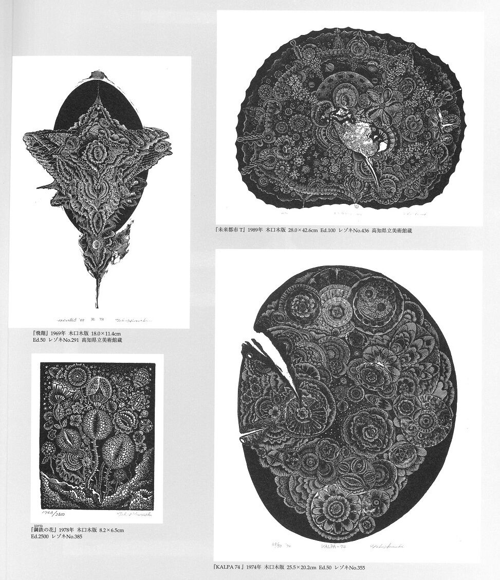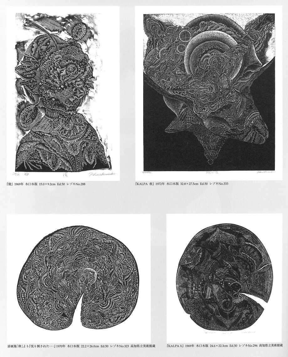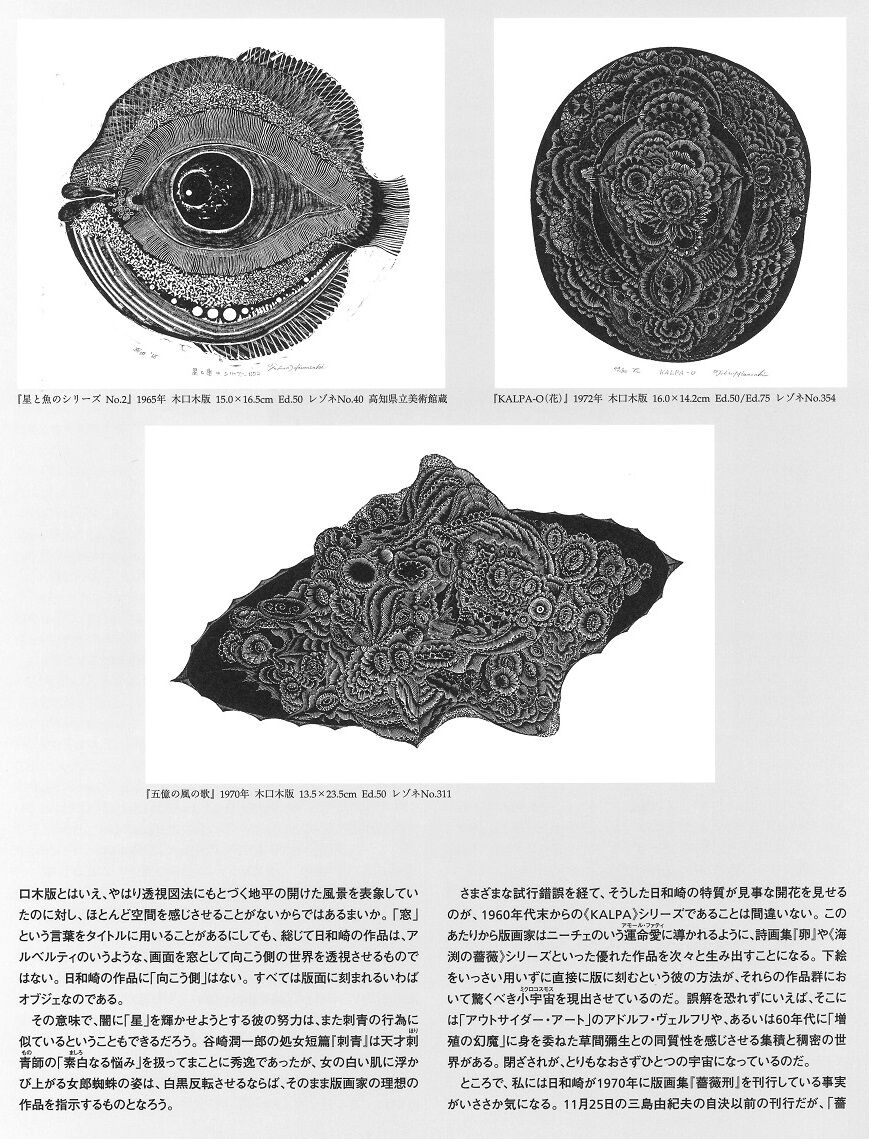 さまざまな試行錯誤を経て、そうした日和崎の特質が見事な開花を見せるのが、1960年代末からの《KALPA》シリーズであることは間違いない。このあたりから版画家はニーチェのいう運命愛(アモール・ファティ)に導かれるように、詩画集『卵』や《海渕の薔薇》シリーズといった優れた作品を次々と生み出すことになる。下絵をいっさい用いずに直接に版に刻むという彼の方法が、それらの作品群において驚くべき小宇宙(ミクロコスモス)を現出させているのだ。誤解を恐れずにいえば、そこには「アウトサイダー・アート」のアドルフ・ヴェルフリや、あるいは60年代に「増殖の幻魔」に身を委ねた草間彌生との同質性を感じさせる集積と稠密の世界がある。閉ざされが、とりもなおさずひとつの宇宙になっているのだ。