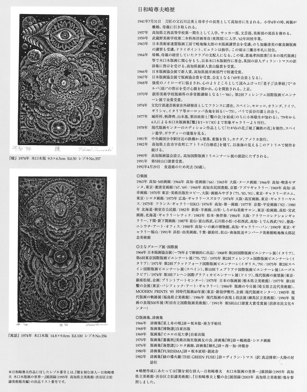日和崎尊夫が画家にならずに版画家に、それも板目木版から始めながら自らの運命に導かれるように木口木版にのめりこんで、その新たな可能性を斬り開くような版画家になったのは、硬い木口に鑿をふるうその物質的な抵抗感、その確かさと不安のようなものにとらえられたからに相違ない。これはまったくの推測だが、幼なくして両親の離婚を経験し母親のもとで成長した日和崎にとって、日本刀の研師でありまた刀剣鑑定士でもあった父親の存在が、彫刻刀(ビュラン)を握るときに多少とも感じられなかったはずはないと思う。日和崎はそうして血の連続性のようなものをひそかに確認していたのではあるまいか。