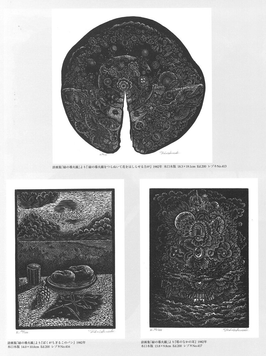 日和崎が木口木版にこだわる理由のひとつが、ここにあるのではないか。木口木版の開拓者トーマス・ビューイックの技法を継承して独自の世界を展開したウィリアム・ブレイクの作品のなかに、いみじくも神が天から地上にコンパスで線を引きながら世界を創造するという図柄のものがあるが、木口木版画家もまさしく己れを一個の神として線的に世界を創造するといえるだろう。日和崎は木ロ木版というものに出会って、その都度、神としての創造に身を委ねることを選んだのだ。