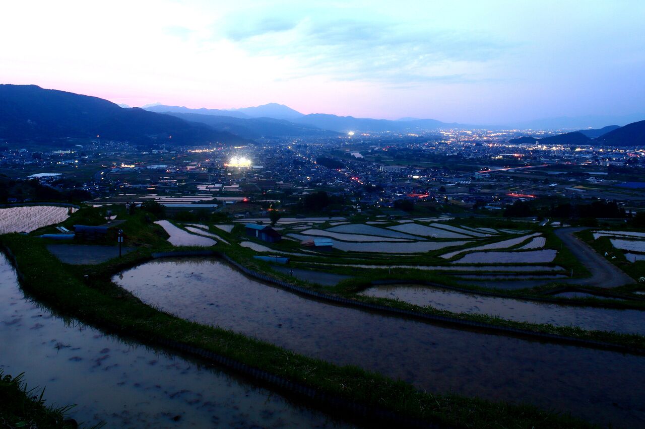 202102平嶋彰彦‗ph6-6V7A2236-bph6 姨捨棚田。この辺りは1697(元禄10)年以降に開かれた。奥は善光寺平。2015.5.23