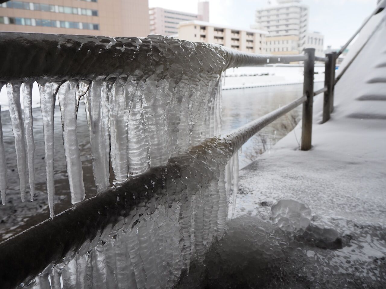 久しぶりに北上川を覗いてみると、冬になる前に比べて随分水量が減っていて、川底の黒い岩が幾つも顔を覗かせています。いま水は雪のまま山に蓄えられているところ、春の雪解けで一気に水量は元に戻るでしょう。しかし、それはまだもう少し先のこと、橋のたもとの日陰では、歩道の手すりに大きな氷柱がありました。