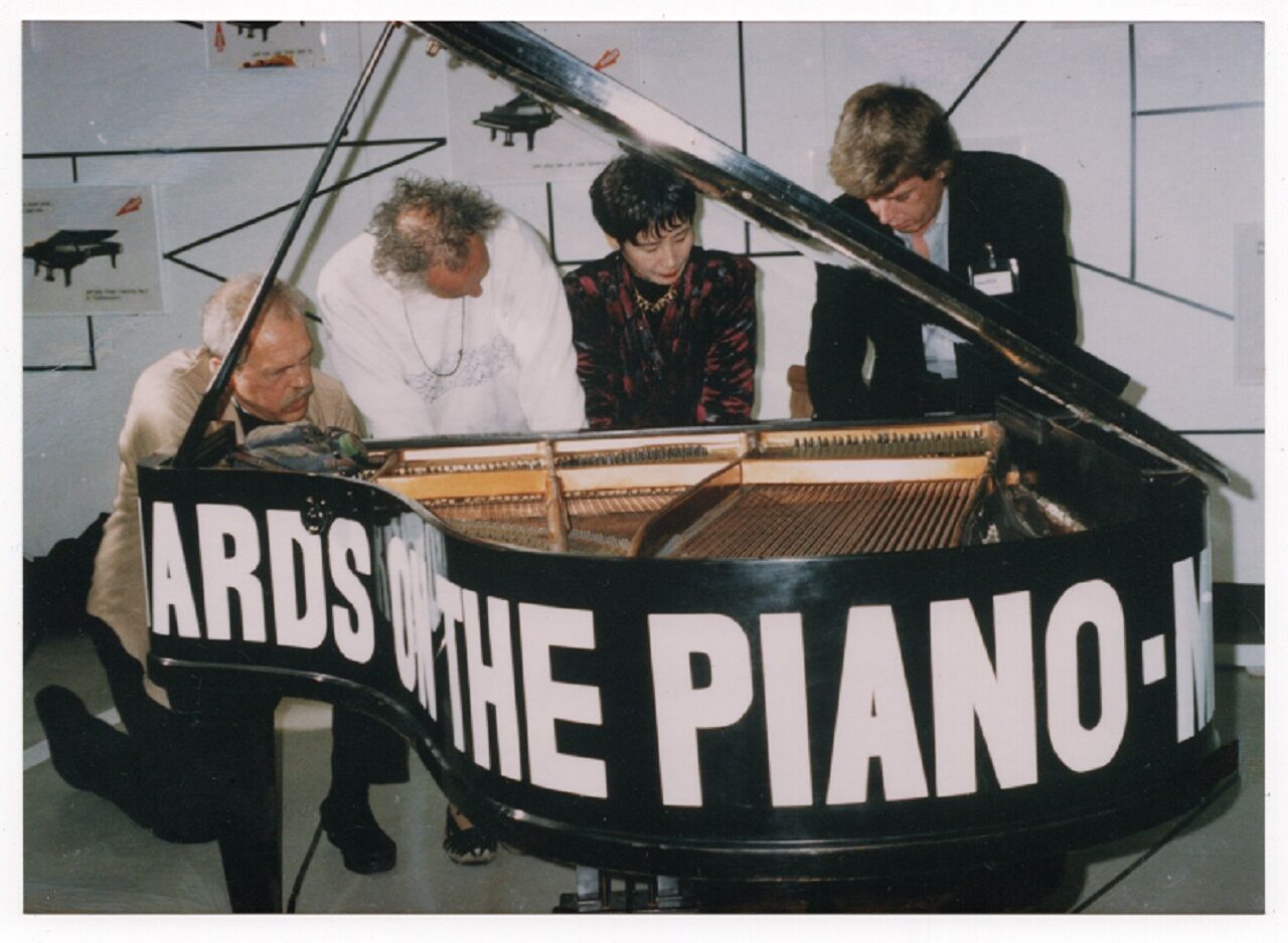 写真(4)ケルンケルンの「フルクサス・ヴィールス」で、筆者のピアノ・インスタレーションを使ってエリック・アンダーセンのOp.16を演奏。左からディック・ヒギンズ、フィリップ・コーナー、筆者、エリック・アンダーセン。