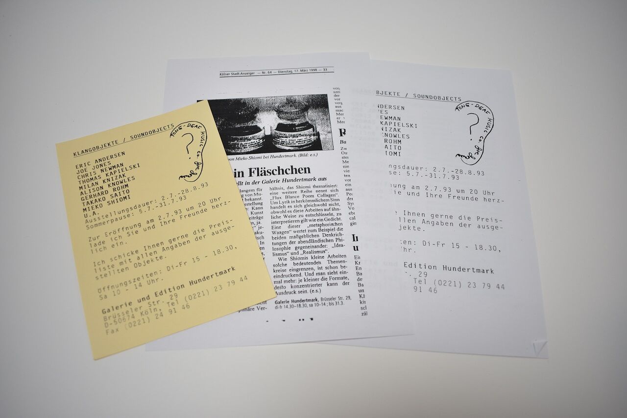 その他、アムステルダムでGalerie Aを経営するハリー・ルーエや、ジェノヴァで昨年50周年を迎えたUnimedia Modernのカテリーナ・グァルコなどとも、今でもお付き合いがありますが、私が一番多く関わったのはケルンのGalerie und Edition Hundertmarkでした。1993年の「サウンド・オブジェクト展」に始まり、94年の「ブック・オブジェクト展」。その他個人的にも、2種類の<SHADOW EVENT>のエディションやカセットテープ、CDなどの出版。又、98年には個展も開いて下さいました。日本という遠い国に住んでいる私でさえこんな有様ですから、現地に居るメンバー達の動きが如何に活発だったかは推して知るべしでしょう。 作家というのはそれぞれに孤立して漂う存在に過ぎません。彼らに主題を与えて創作意欲を刺激し、一点に集約して大きな形として世に問う、という作業を行なってきたギャラリストやコレクター達の参画があったからこそ、マチューナスの死後もフルクサスは長年、さまざまな地域で存続してきたのではないでしょうか。