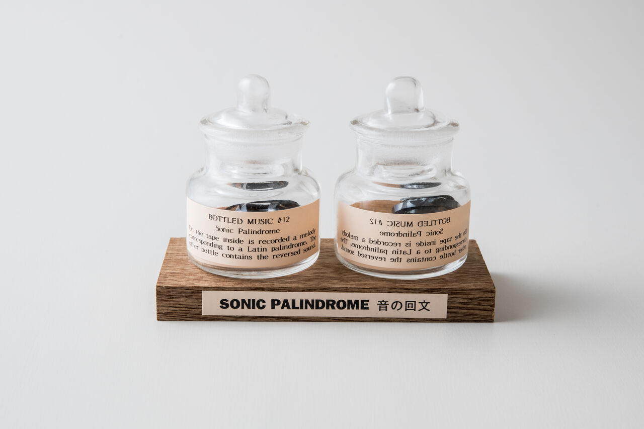 Sonic Palindromeこの作品は言葉も音も鏡像形になっています。先ず、ラテン語の回文IN GIRUM IMUS NOCTE ET CONSUMIMUR IGNI(夜に 我々は円に向かって行く そして火によって吸収される)の一文字ずつに音高と時価を与え、それをシンセサイザーで演奏して録音しました。両方の瓶にはそれ自体が鏡像形の楽譜が入っていますが、左側の瓶のテープには通常の音が、右側の瓶のテープにはそれを逆回転にした音が録音されています。因みにこの回文は、「フルクサス・バランス」用にイタリーのジャンニ・サッシ氏から献呈されたものです。