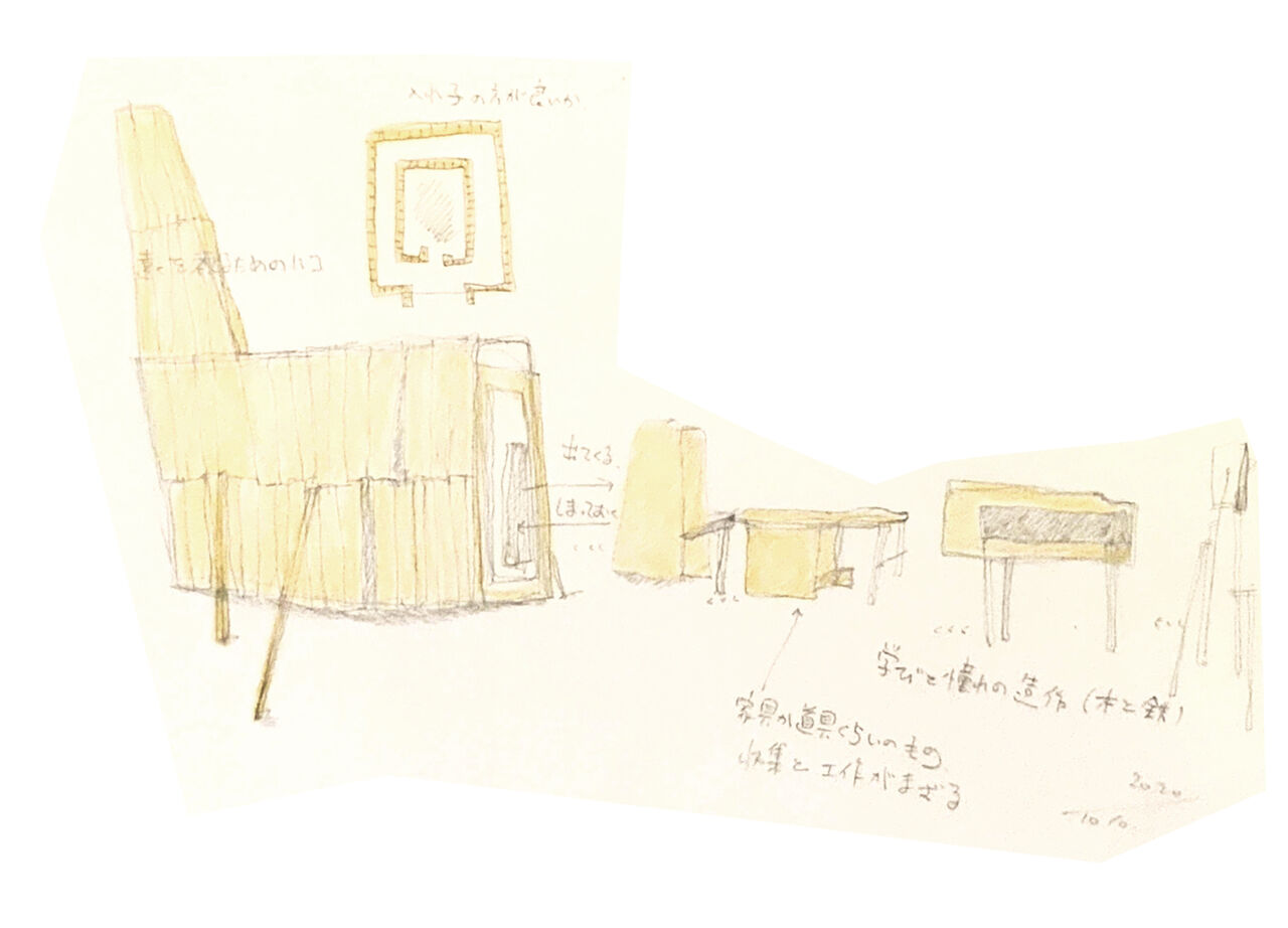 (少し前のスケッチだが、動くハコについての構想。今はもう少し考えが進んでいる。)(さとう けんご)