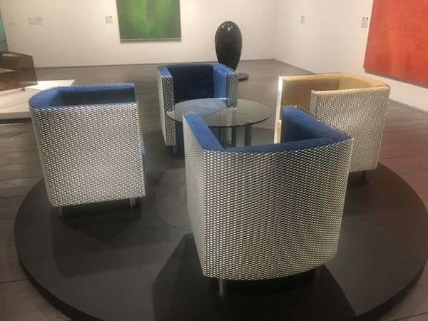 倉俣史朗と田中信太郎」セクションに展示されている《エキスパンド・チェアー》の中のクッションはスウェードのような生地で、展示品とは別に会場のいたるところに置かれた《エキスパンド・チェアー》は淡い色のレザー(?)に張り替えられており、こちらは自由に座ることができます。包み込まれるような体にフィットする椅子。行かれる方は是非お座りになることをお勧めします。