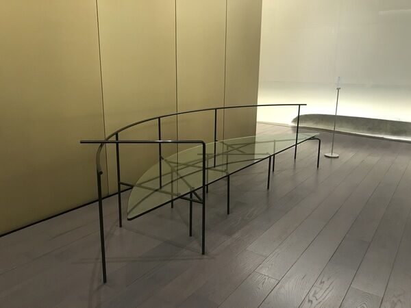大きなガラス板が座面になっている椅子《ガラスのベンチ》(1986)は、普段は自由に座れるようにしているそうですが、今回は展示物の一つとなっていました。「どうぞお座りください」と声をかけていただき、恐る恐る大きなガラス板に腰かけました。全体重をかけてはいけないように思ってしまう緊張感のある椅子で、かっこいいデザインでした。