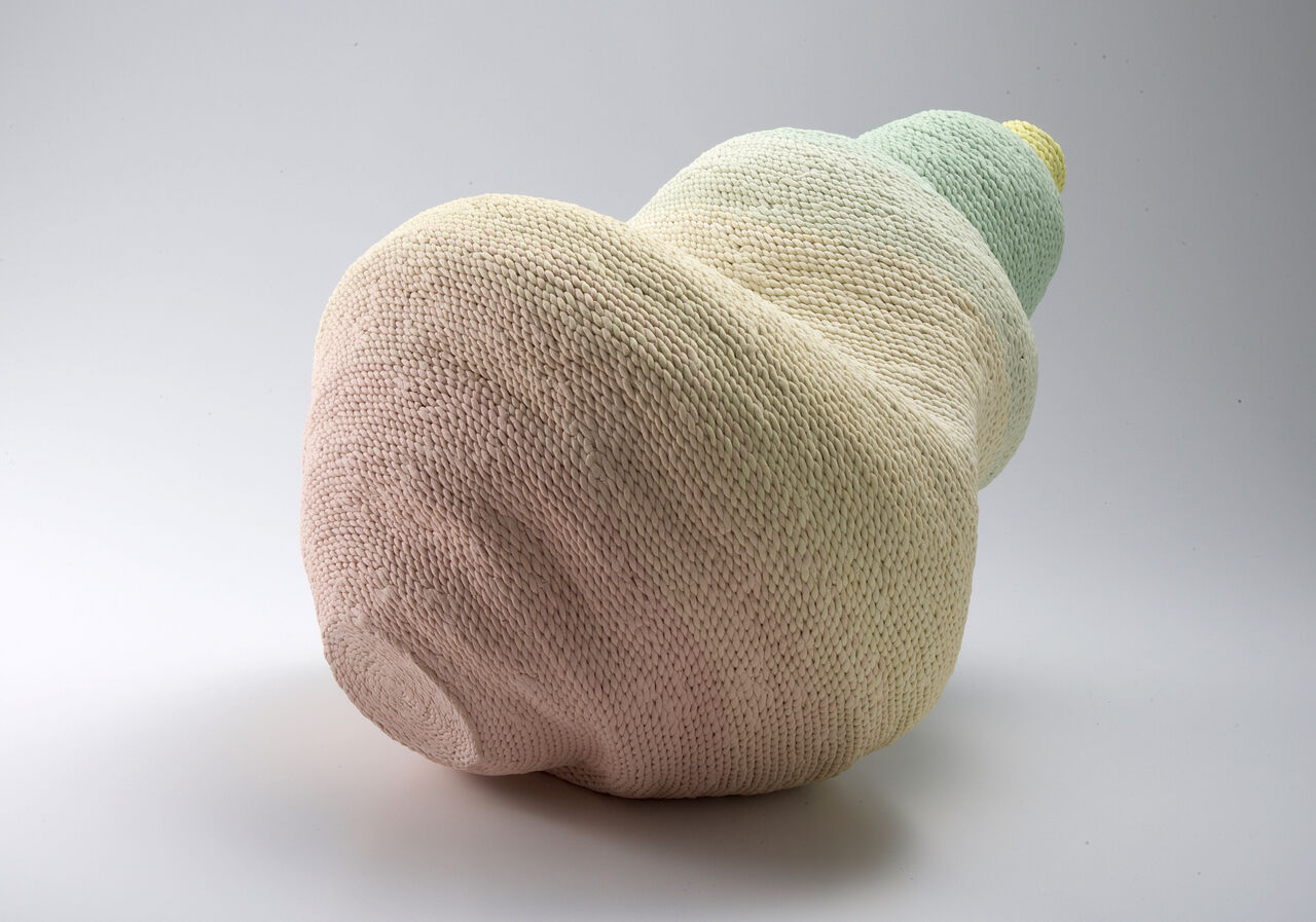 わたしが制作に用いるのは陶芸です。土を紐状に伸ばし下から少しずつ積み上げる「ひもづくり」というやきものの原始的な手法で成形し、電気窯で焼成します。わたしは通常よりも紐を細く伸ばし、複数を撚り合わせることで形をつくりあげた粘土の集積が編み物のように見える作品を制作しています。