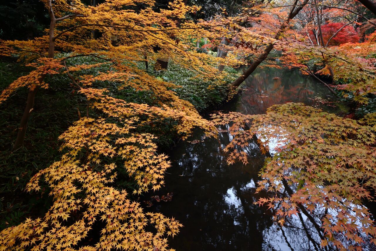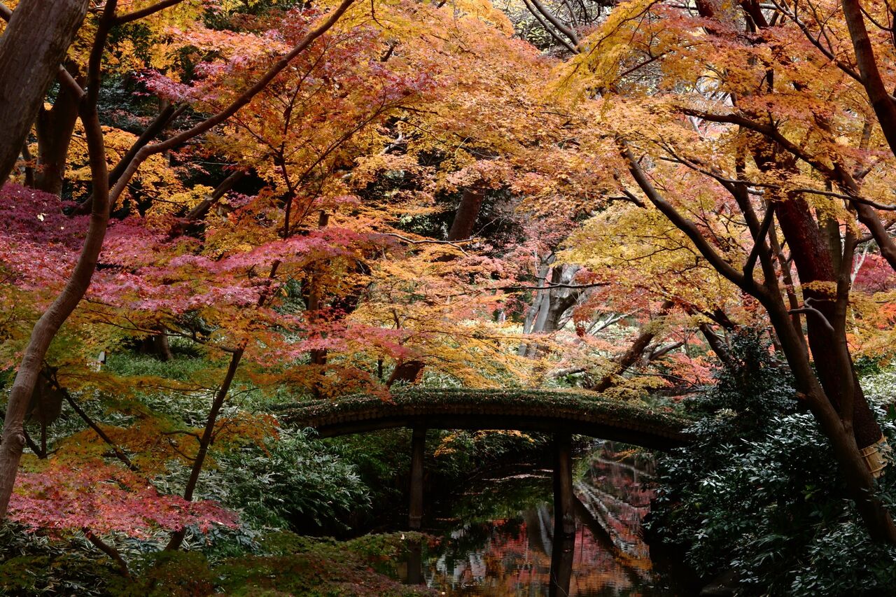 問い合わせると、コロナ渦だが予約すれば入園できて、いまが紅葉の見どころだという。その日は前日から雨だったが、私が入園した直後に雨はやんだ。そのためか園内は人影がまばらで、鮮やかに色づいたモミジやカエデを贅沢な気分で眺めて廻ることができた。