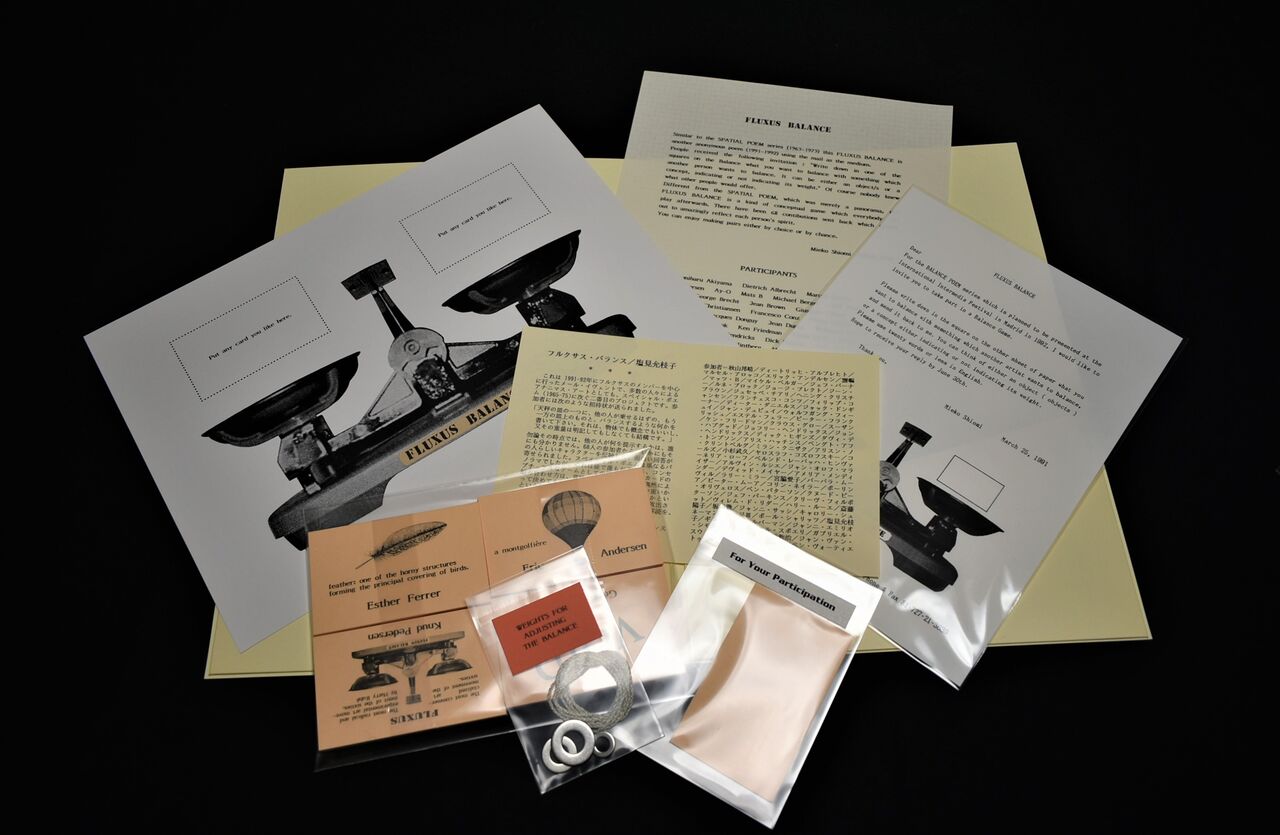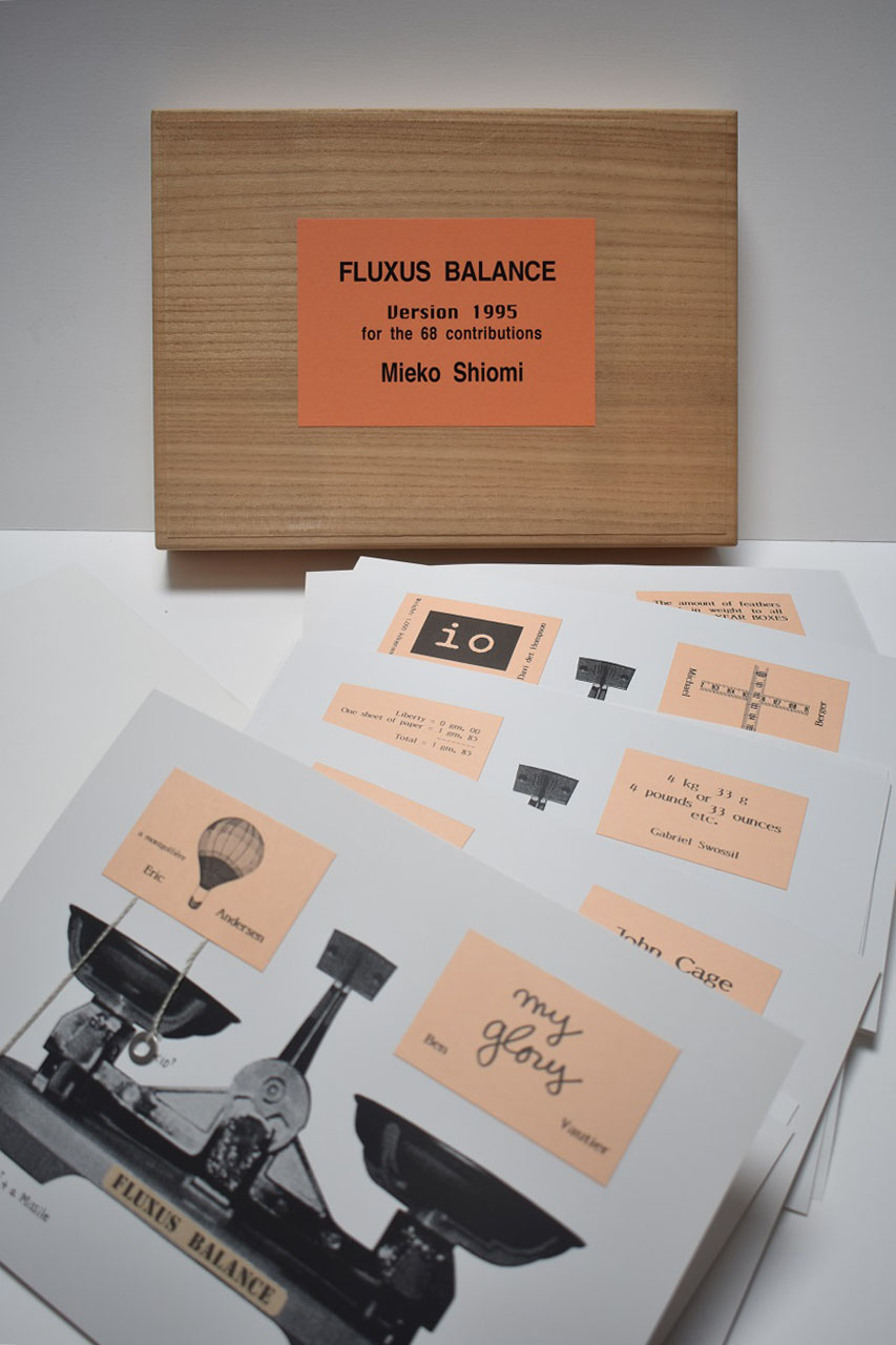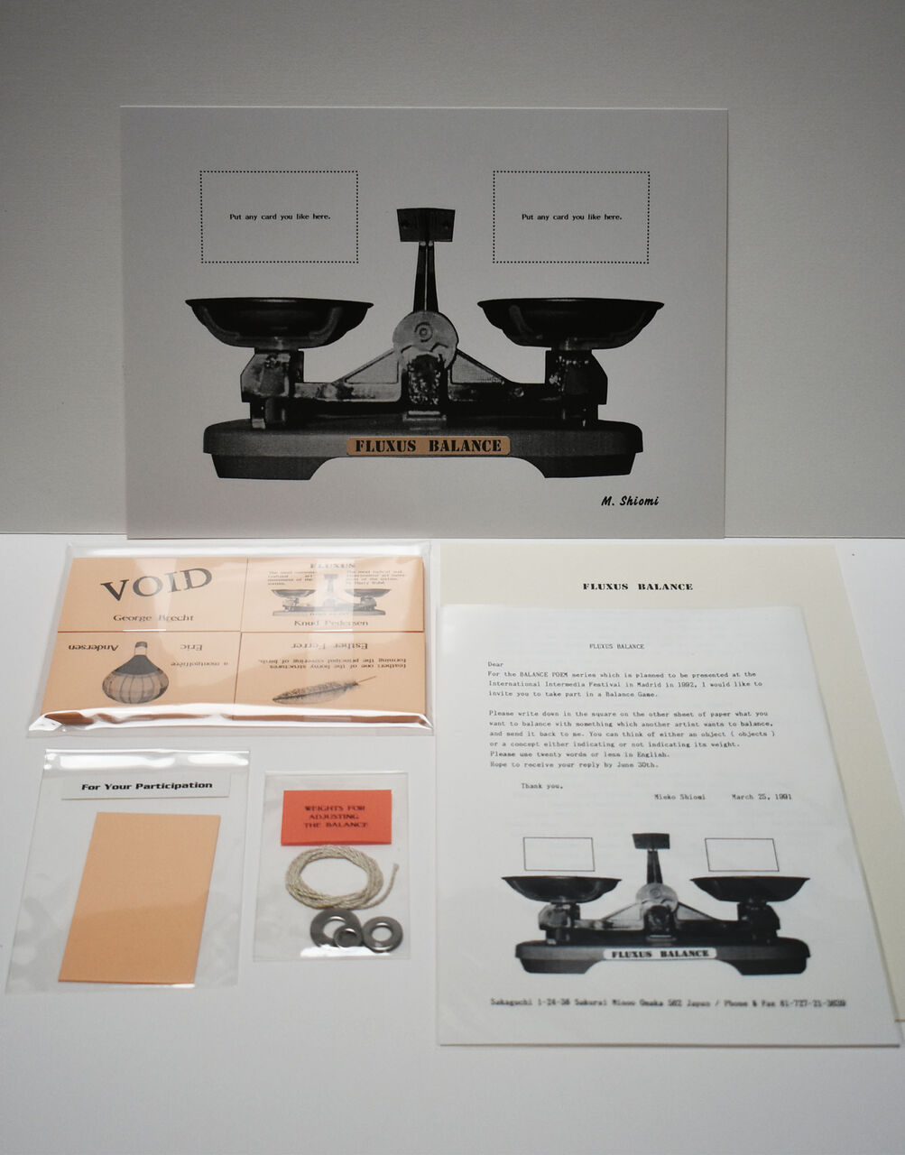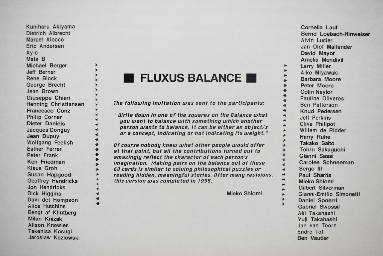天体の運行も生命体の内部も、全て絶妙なバランスの上に成り立っているとの思いから、この概念でフルクサスの友人達と詩的なゲームを行なうべく、天秤の皿の一方に、誰かが乗せる筈のもう一方のものと釣り合うような何かを呈示するよう依頼した共同作品です。