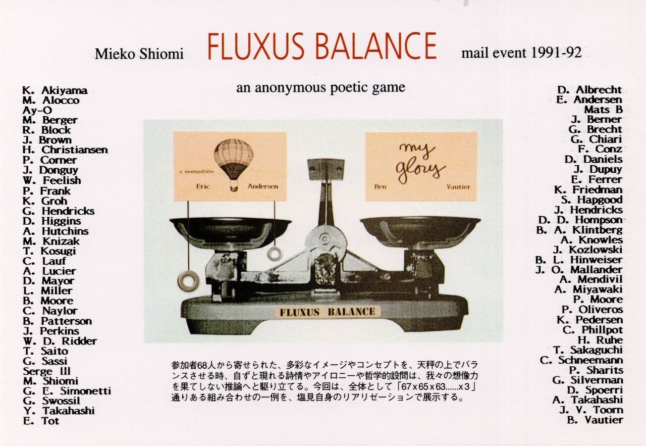 フルクサス・バランスへの68の回答を、34枚の天秤の写真上で筆者が組み合わせ、ジーベック・ホワイエで展示したときの案内状。こうして私達日本人は海外の催物に度々招待されるのですが、逆に海外のメンバーを日本へ招待することが出来ない、というのがアイオーさんと私の悩みでした。