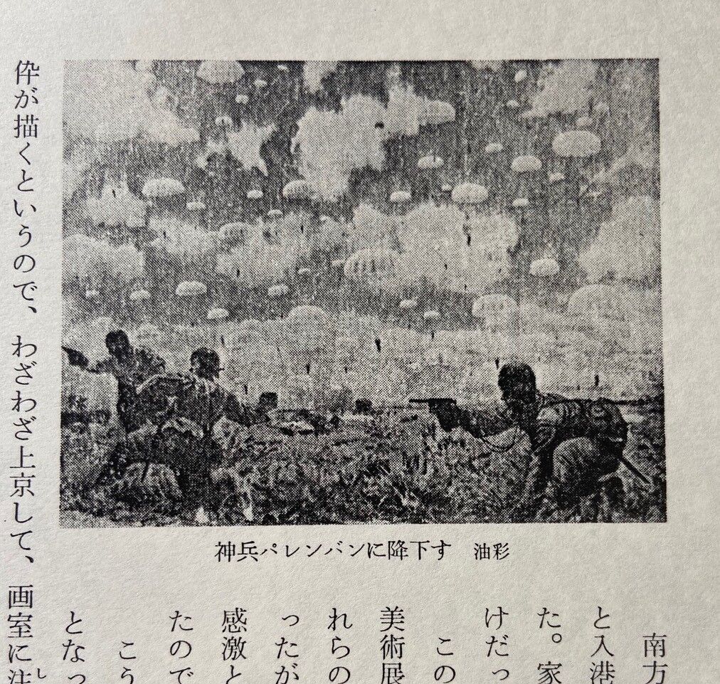 図4 鶴田吾郎『神兵パレンバンに降下す』前掲書コピーの挿図戦争協力者、戦犯画家と言われつつも、戦争に子どもたちを奪われた鶴田吾郎の思いを想像すると、今更ながらに「戦争」というものを考えざるを得ない。