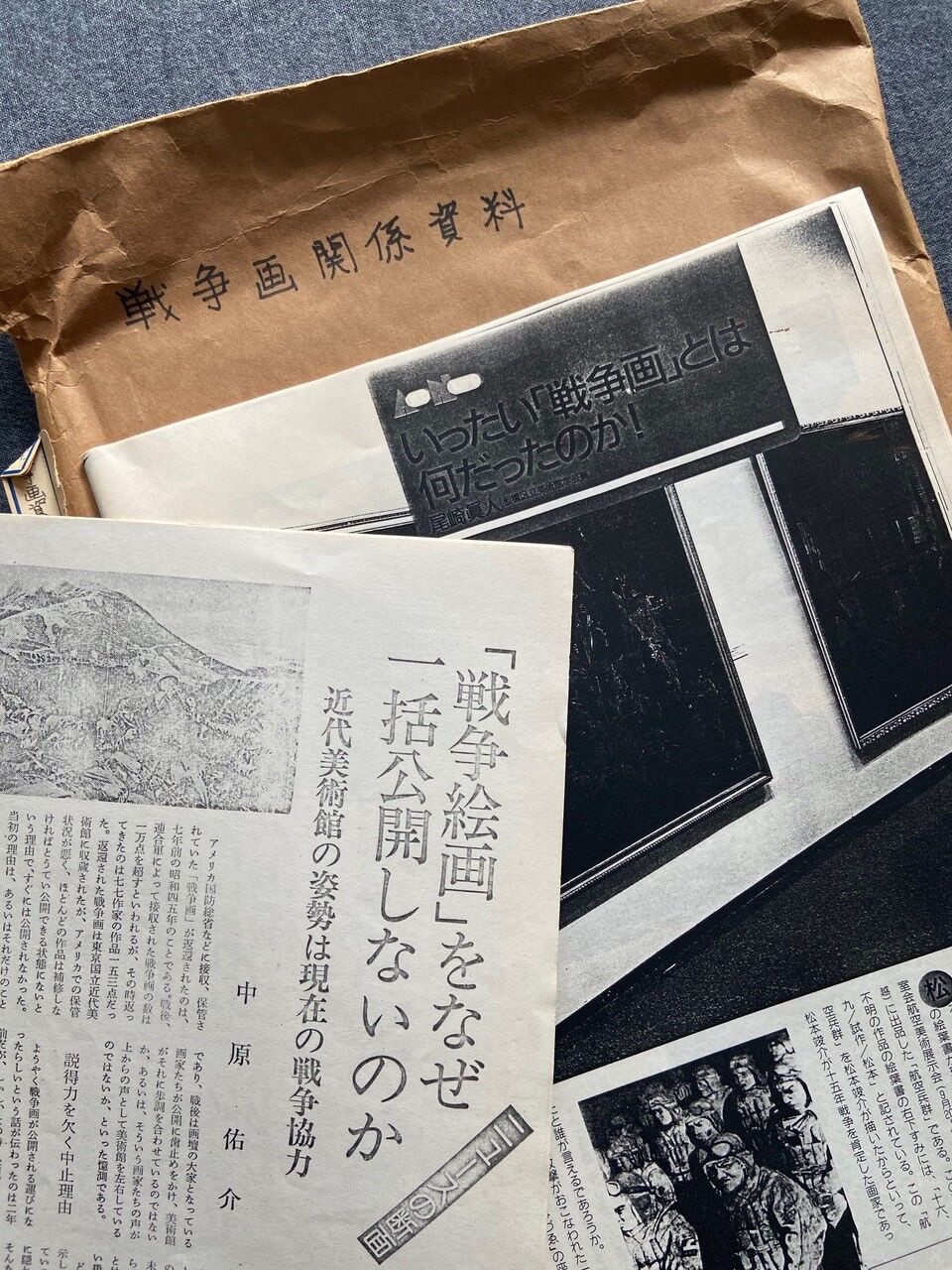 多少時間に余裕ができてきたので、研究資料の整理を少し、し始めた。古い資料が出てきた。「戦争画関係資料」と書類封筒にある(図1)。1977年の朝日ジャーナル誌に掲載された評論家中原佑介の「『戦争絵画』をなぜ一括公開しないのか」といった文章のコピーや、松本竣介の「航空兵群」の図版が載る1988年の芸術新潮の尾崎眞人の「いったい『戦争画』とは何だったのか!」の記事のコピーなど、いくつかの資料のコピーが、未整理のまま袋に入っている。