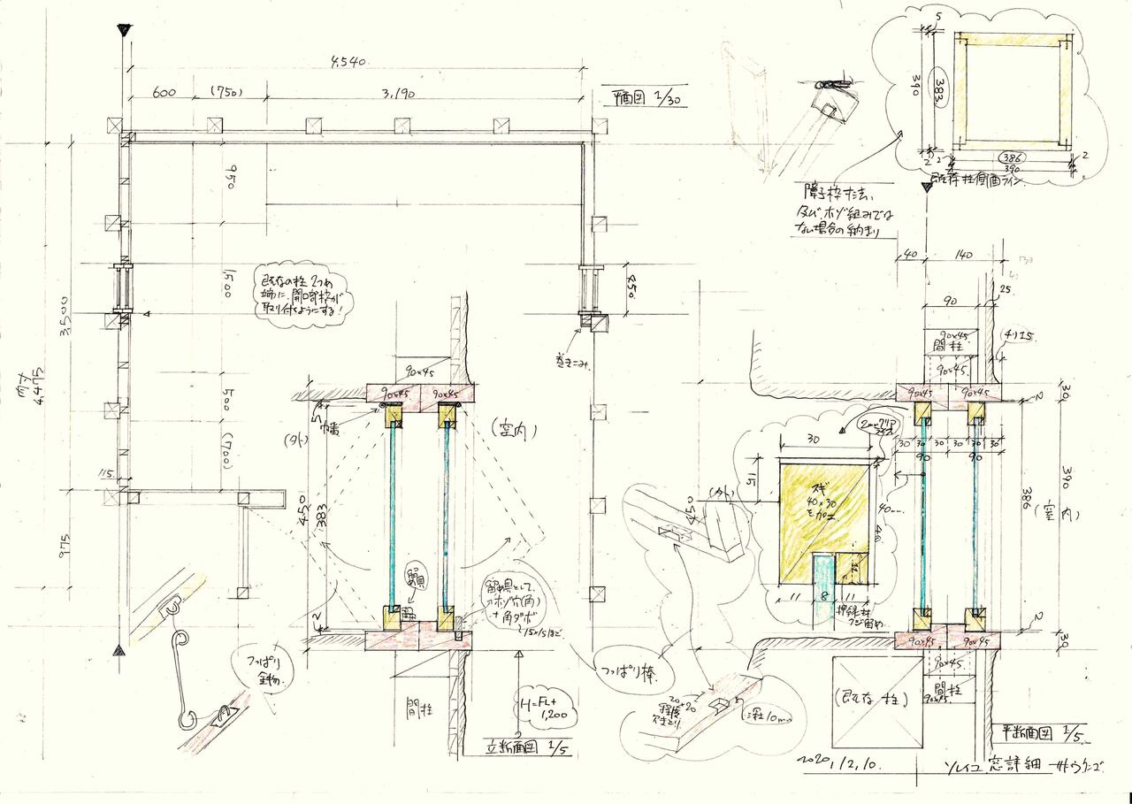 昨年の晩秋ころから隣町の二本松市(正確には東和地域)で蔵の改修の現場が始まり、工事の一部を請け負わせてもらい、現場のための図面の大半は規模の小ささからしても手で描いた。数日に1度現場に通う日々が続き、そこで毎日工事をしてくれている地元の大工さんに相談をしたり、材を拾い出し、手配をしたり、現場で採寸しながら納まりの図を描いたり、現場で出た古材をゴシゴシ磨いたり。