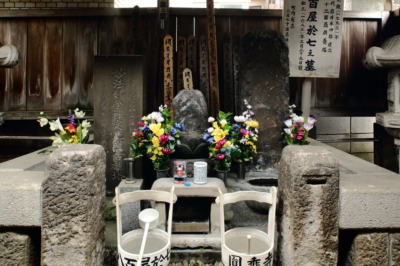 ph4 八百屋お七の墓。円乗寺。白山1-34。右の石塔は岩井半四郎の建立。2018.05.23