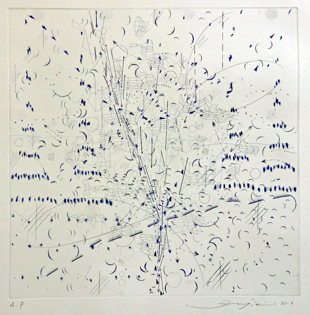 40年前に富山市内の印刷所で見つけた菊全サイズの電動プレス機でのリトグラフ制作はもう体力的にできませんが、銅版画制作は寒くて体が動きにくい冬の制作です。大画面の絵画と銅版画の画面との接点がわからないと言われることがあります。ここ数年のエッチングでは制作意図は絵画と同じつもりです。絵画では隣接しているのに重なって見える筆触が作る絵画空間、銅版画では記号に見えるラインの連なりが勝手に重なって発生する空間。どちらも最終的な全体像は未決定です。そして部分を見ると偶然に出会っている筆跡の無関係の関係が面白いと思っています。どこか違う世界のことを描いているのではなく、「絵が在るとしたら平面すれすれに発現するもの」と考えています。コロナ禍で多くの方が大変に困難な状況にさらされている折、個人的には人と接することは少なくてさほど変わりない日々なので今はこれからのさらなる老いを見据え制作の環境を立て直し中です。