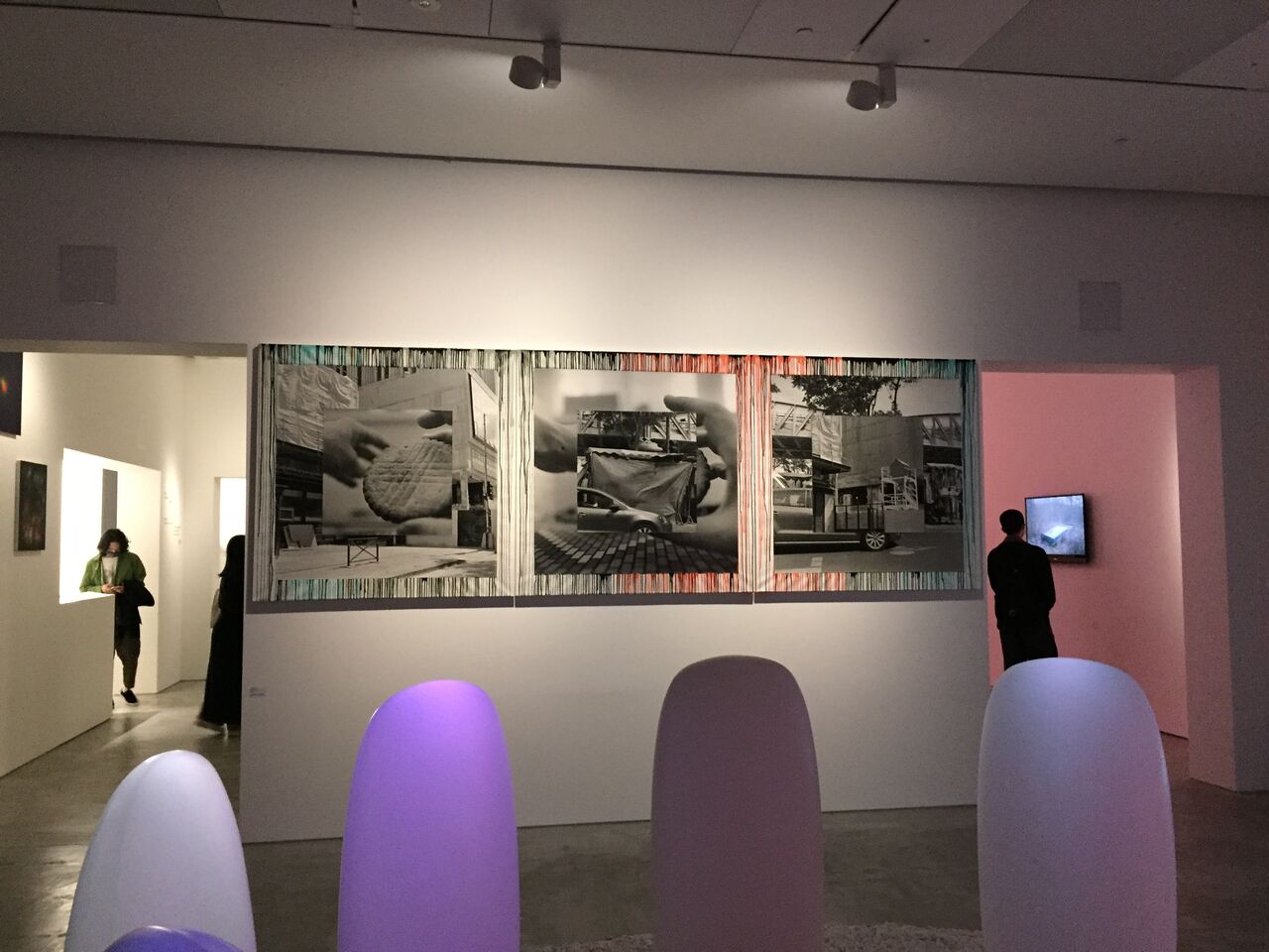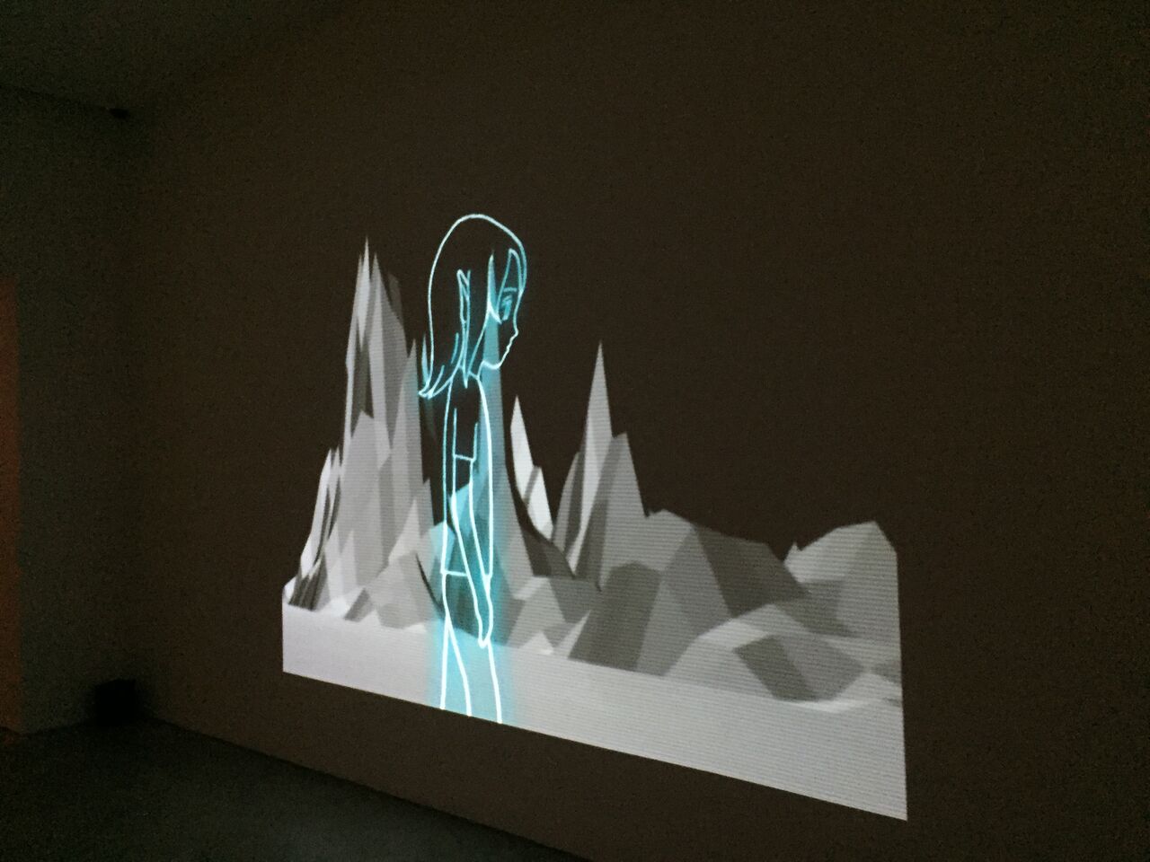 続いて、「月面とポストトゥルース」と題された第2展示室では、周期的/反復的なものごとの考え方を思わせる森万里子の《トランスサークル》、異なる所で撮られた写真がコラージュされ入れ替えられ、時間と場所、始まりと終わりが混ざっていくようなオノデラユキの《月の裏側 No.1》、時流に取り残されていたキャラクターが再生され、月面を彷徨っているピエール・ユイグの《100万年王国》、参考としてウィキリークスが公開した「ネバダ砂漠で撮られた月面着陸の未使用動画」が展示されています。ここでは、現在2021年の混沌とした状況が表現されているのでしょうか。状況を打破するために、既存のものの見方や普遍的な常識を疑うこと、直線的ではなく円環的な発想、匿名性といったキーワードが浮かびました。