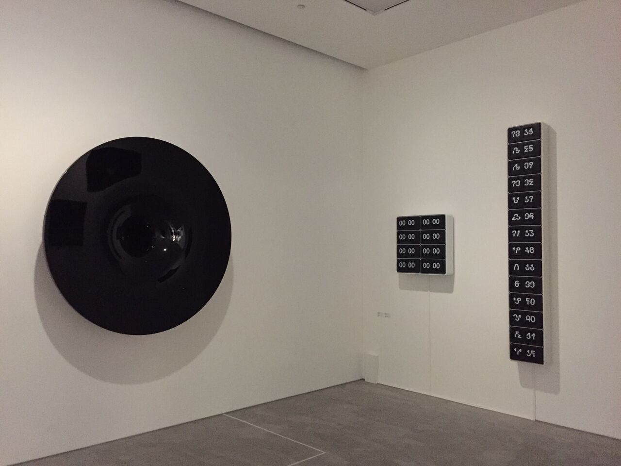 本展はギャラリー面積約140㎡のうち、エントランスを除く3つの展示室に9組の作家の作品が展示されました。「時空の歪み」と題された第1展示室には、空間を閉じ込めるという反転の発想にどきりとする赤瀬川原平の《宇宙の罐詰》、黒い闇に吸い込まれるようなアニッシュ・カプーアの《サイフォン ミラー_クロ》、一定に流れているニュートン的な絶対時間が壊れたり狂っていくようなダレン・アーモンドの《Perfect Time (14 x 1) 》と《Intime (4 x 2)》などが並び、地球上で私たちが一般的に慣れ親しんでいる絶対時間と絶対空間という時空の概念が揺らぐような導入部でした。