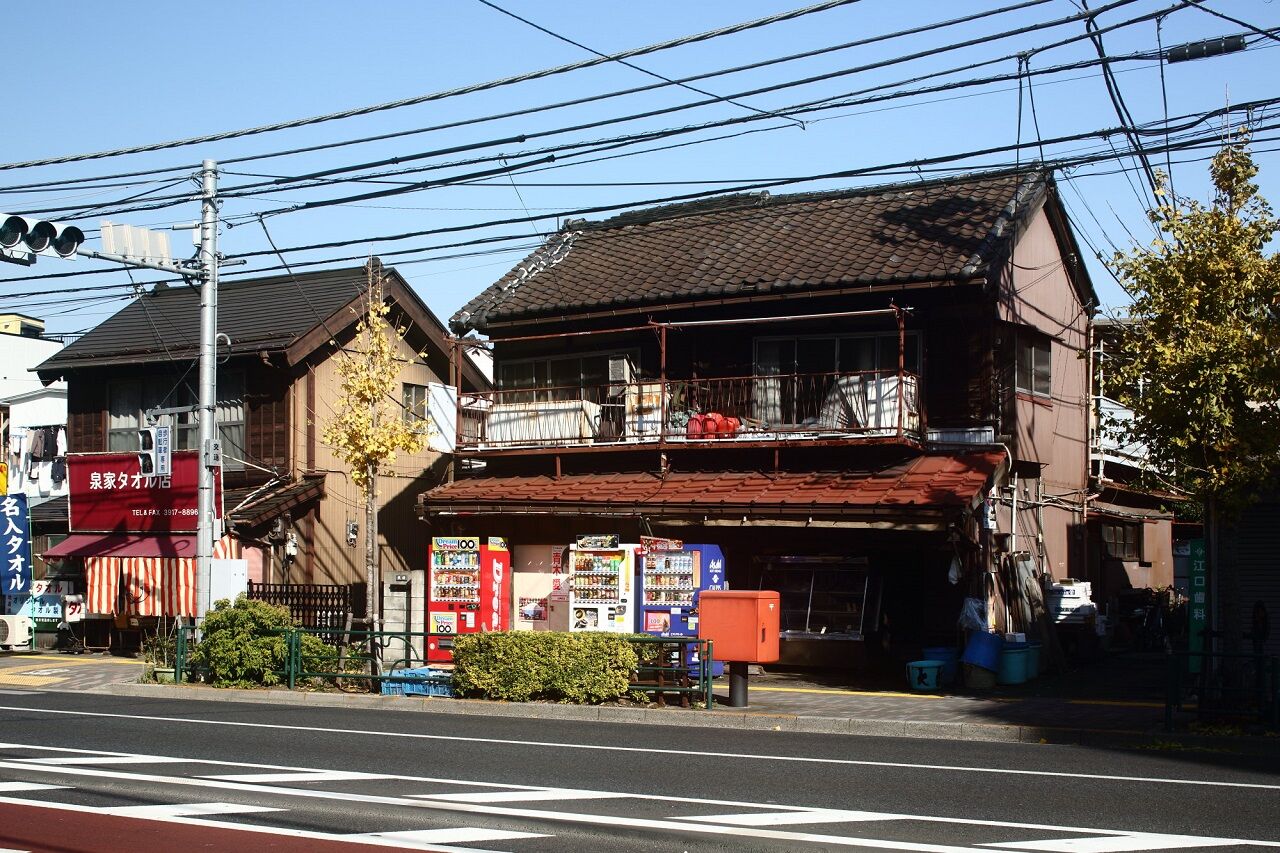 ph17 本郷通り。河村魚店(右)と泉屋タオル店(左)。西ヶ原2-14。2012.12.08