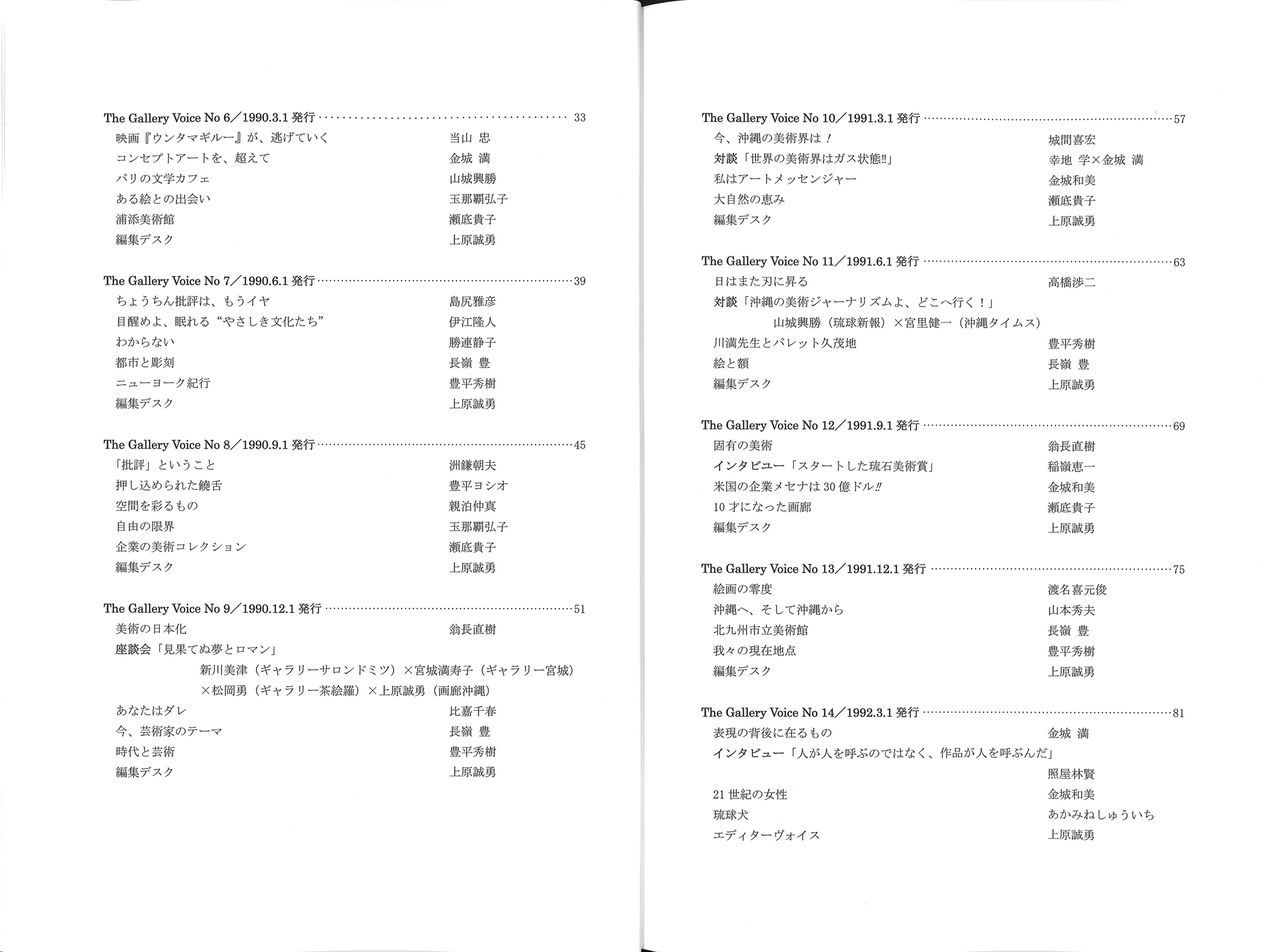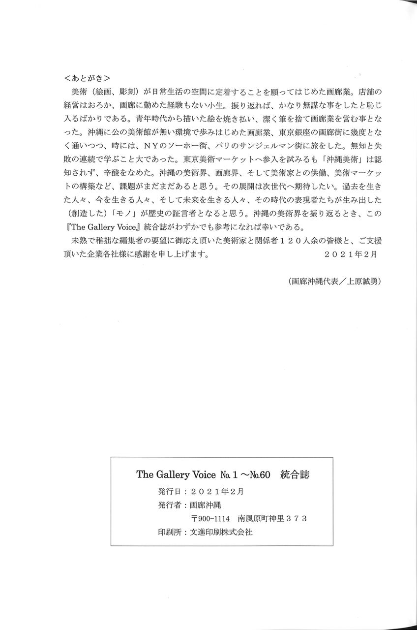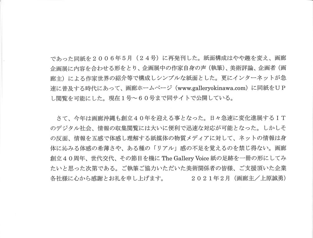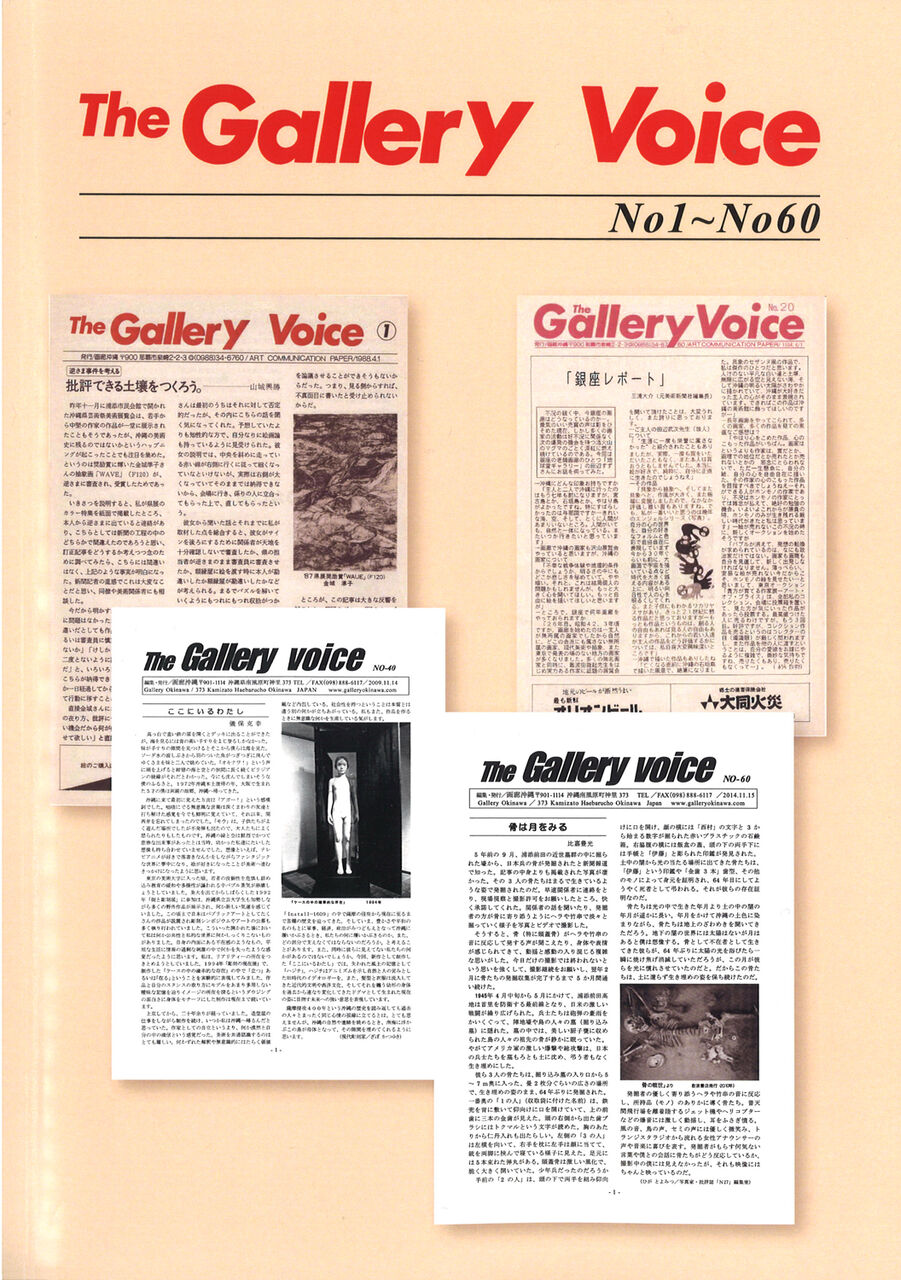 そのおひとり、上原誠勇さんの画廊沖縄がめでたく40周年を迎え、画廊情報誌として1988年から刊行してきた『The Gallery Voice』の60号までを一冊にまとめ(限定200部)、送ってくださいました。