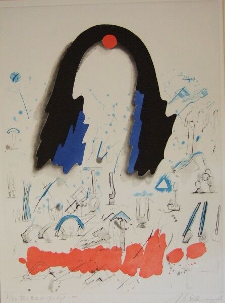 〈絵空事〉シリーズの、すっきりと鮮やかながらも、シルクスクリーン特有のマットで不透明な色彩。くっきりと単色で刷られた部分と、手描きの筆致を残したかのような多色刷り部分のバランス。空を描いた作品の、美しいグラデーション。これらのなかには、環境美術のプロジェクトの源泉といえる作品もある。《月をよぶ》は、後にたびたび出現するモニュメント案の原風景となっているし、《絵空事―鳥居》は主要なモチーフのひとつである門がテーマとなっている。《円いひも》はいくつかのプロジェクトの素描を背景に、継ぎ目のないロープを描くとともに、「考えるより メモを描く版画として」との独白めいたことばを添えている。背景に素描を用いた作品は後年、表紙や目次、扉絵を1年間担当した『現代詩手帖』(1978)でも散見され、1982年の個展でさらに展開されていく。