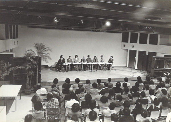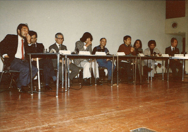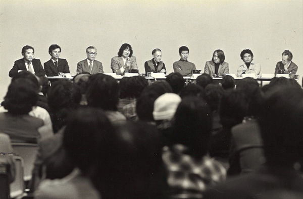 左から、針生一郎、北川フラム(「現代と声」実行委員長)、一原有徳、元永定正、オノサト・トシノブ、野田哲也、飯田善国、関根伸夫、尾崎正教(現代版画センター事務局長)