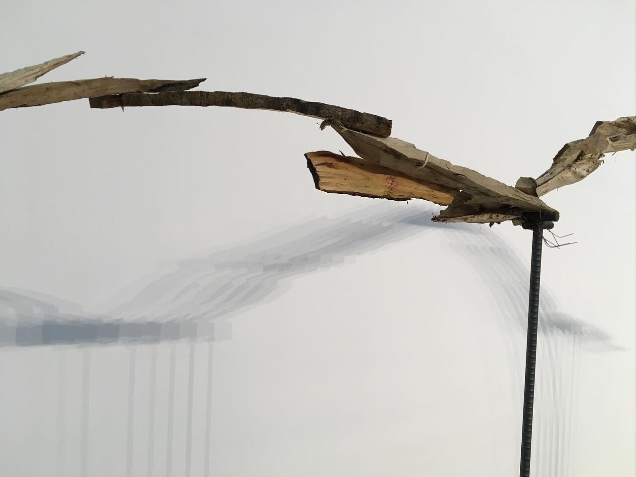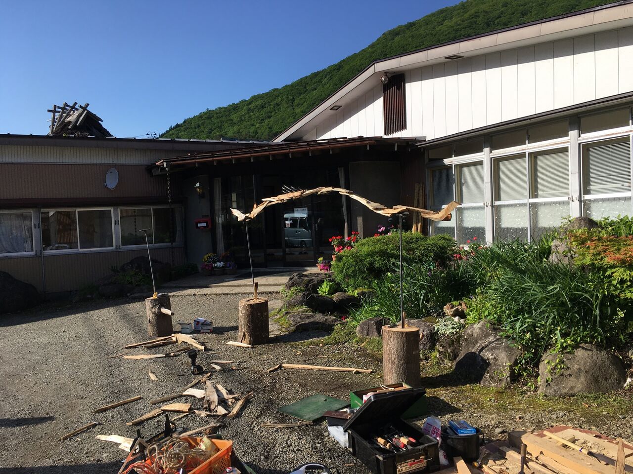 そして、停泊している旅館(太郎兵衛さん)の一角をお借りして、撮影した山の風景の模型化を試みた。ちょうど雨が降り、川が増水して流木が沢山あり、また山の落ち枝を拾ってきて、部材を切り出した。写真が捉えた山の輪郭を、丁寧になぞりながら、山で拾った木材を組み合わせて立体化していく。かなり乱暴な造形だったが、大事な作業であったようにも思える。