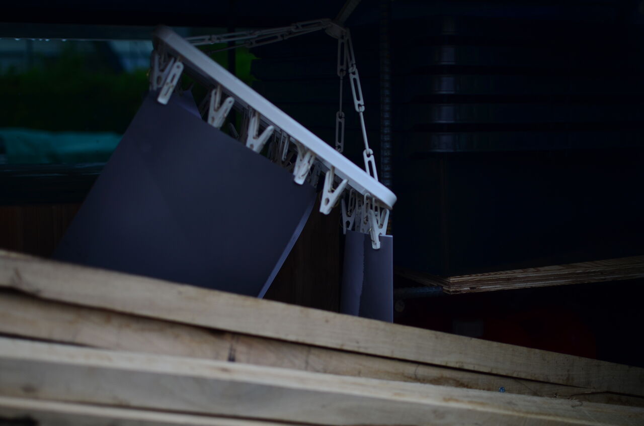 (現場にて、撮影した印画紙の現像作業を行う必要があるので、組み立て式の暗室を併せて制作した。写真は組み立て中の様子。)