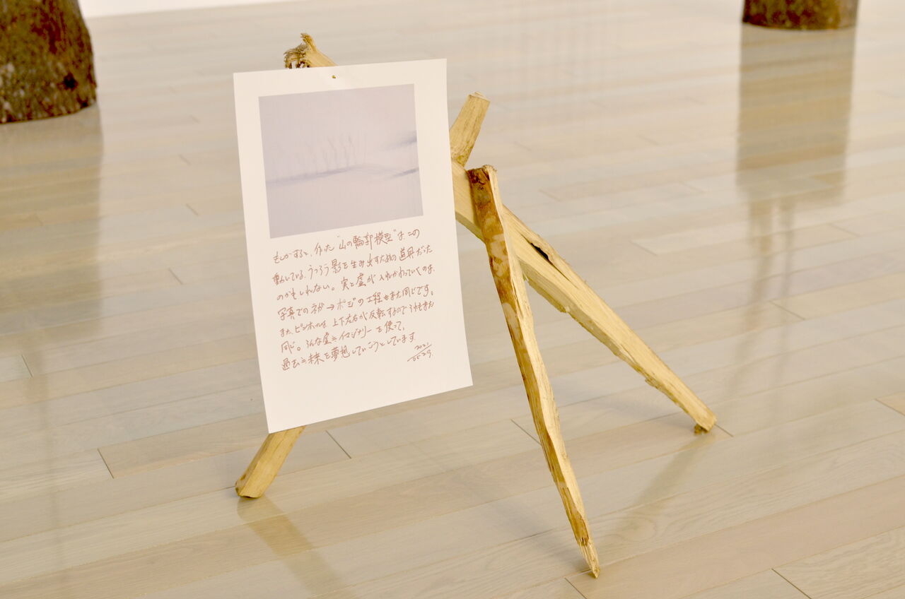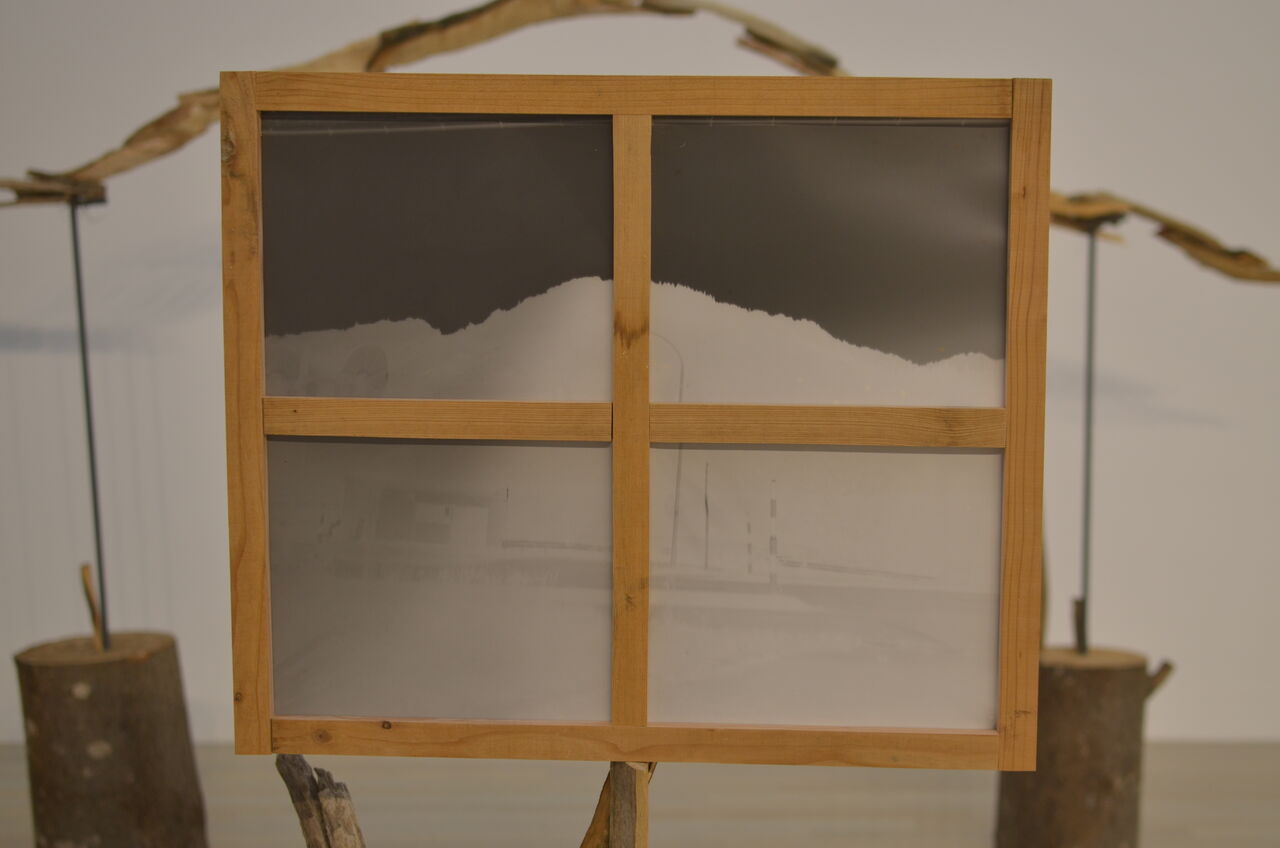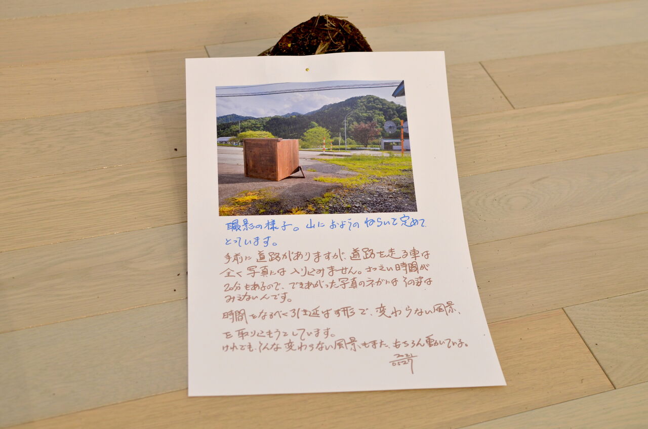 山の写真撮影は、2年前にときの忘れものの展示にて制作した木製写真機を使った方法と同じである。ただ、2年前は300mm立方だったハコを、今回は700mm立方に大型化させた。撮影時間は、晴れた日中でおよそ30分程度である。