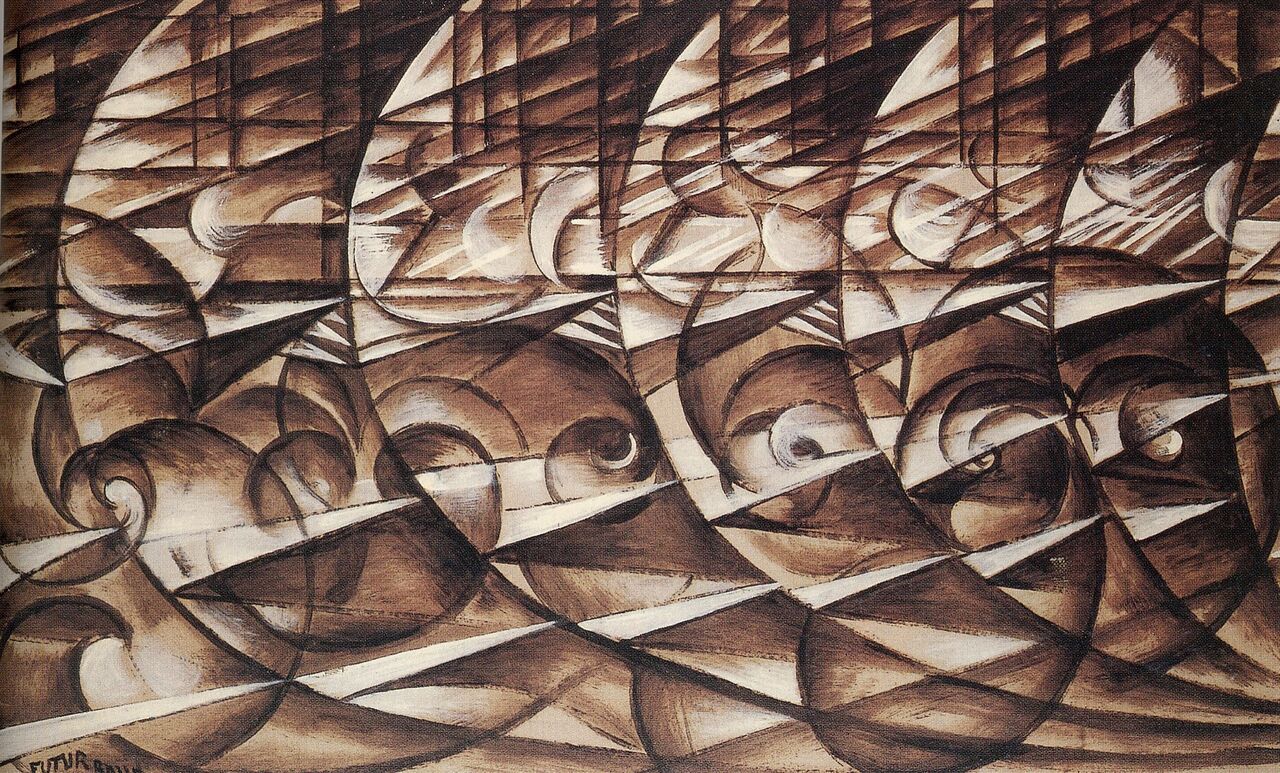 図3:バッラ《ダイナミックな膨張+速度Espansione dinamica + velocità》、1913年(キャンバスに紙とラッカー、64×106㎝、ローマ国立近代美術館)