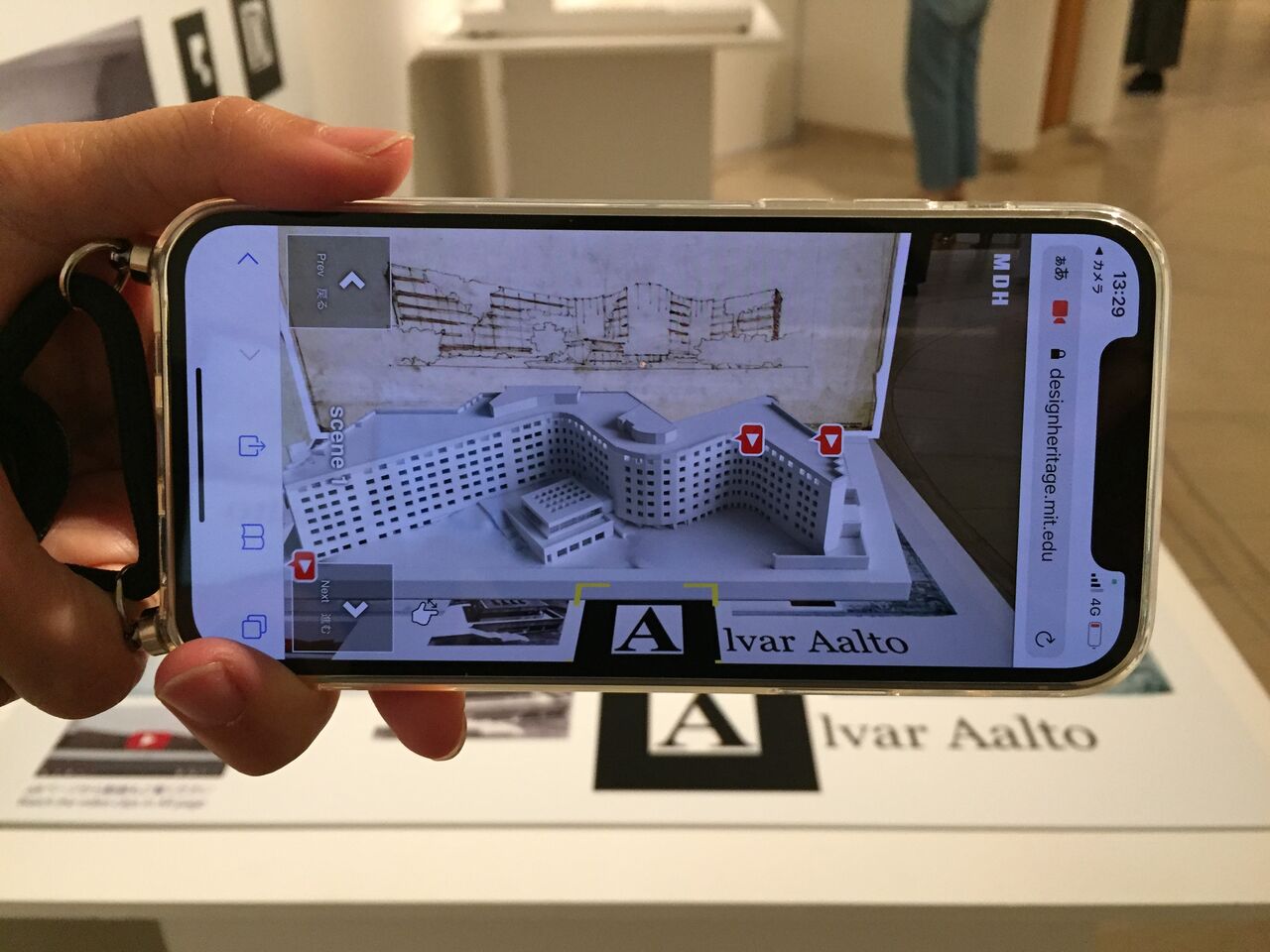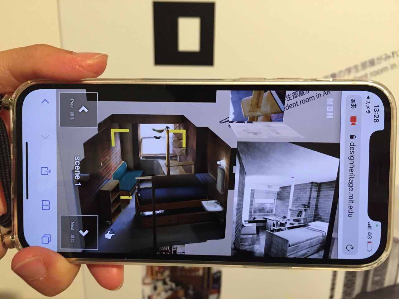 この作品は、AR(拡張現実)での鑑賞作品になっており、スマートフォンに会場のQRコードを読み込んでアプリケーションを起動し、スマホカメラを壁面や展示台にある展示パネルにかざすと、寮の個室の内観3D、暖炉のあるロビーの内観3Dや、建物の外観や内観の映像が見られます。シーンの操作では、建物の模型の3Dから屋根の取れた模型、次に外観の立体写真という順に切り替えることもできました。