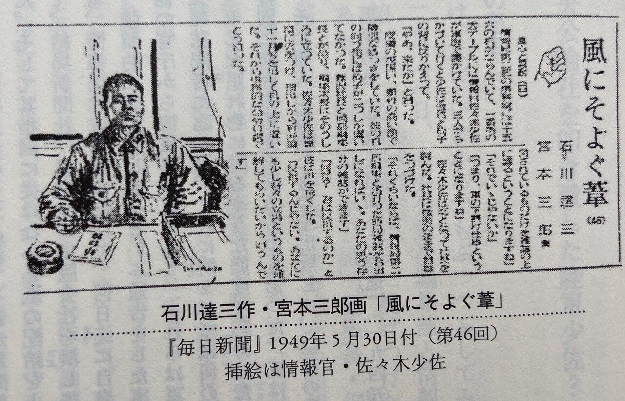 図1 宮本百合子(左から2人目 和服)らと座談会での鈴木庫三(中央 白のジャケット)佐藤卓己『言論統制』よりヨーロッパ文化に対しても一定の理解や教養があっただろうはずの鈴木庫三(図1)が、なに故に粗暴な軍人と世間が思い込むことになったのだろうか。佐藤によれば、そこには石川達三の戦後に書かれた小説『風にそよぐ葦』が関係しているという。これは、戦時中の1942年に起こった特高警察による出版社改造社と中央公論に対するでっち上げの言論弾圧事件、横浜事件などを題材にした「軍部の言論弾圧に抗したインテリ群像を描く社会小説」(注3)で、毎日新聞に前編後編合わせて1949年から1951年の3年にもわたる異例の長期連載(図2)となり、さらに東映によって映画化(図3)をされた当時の人気小説であった。