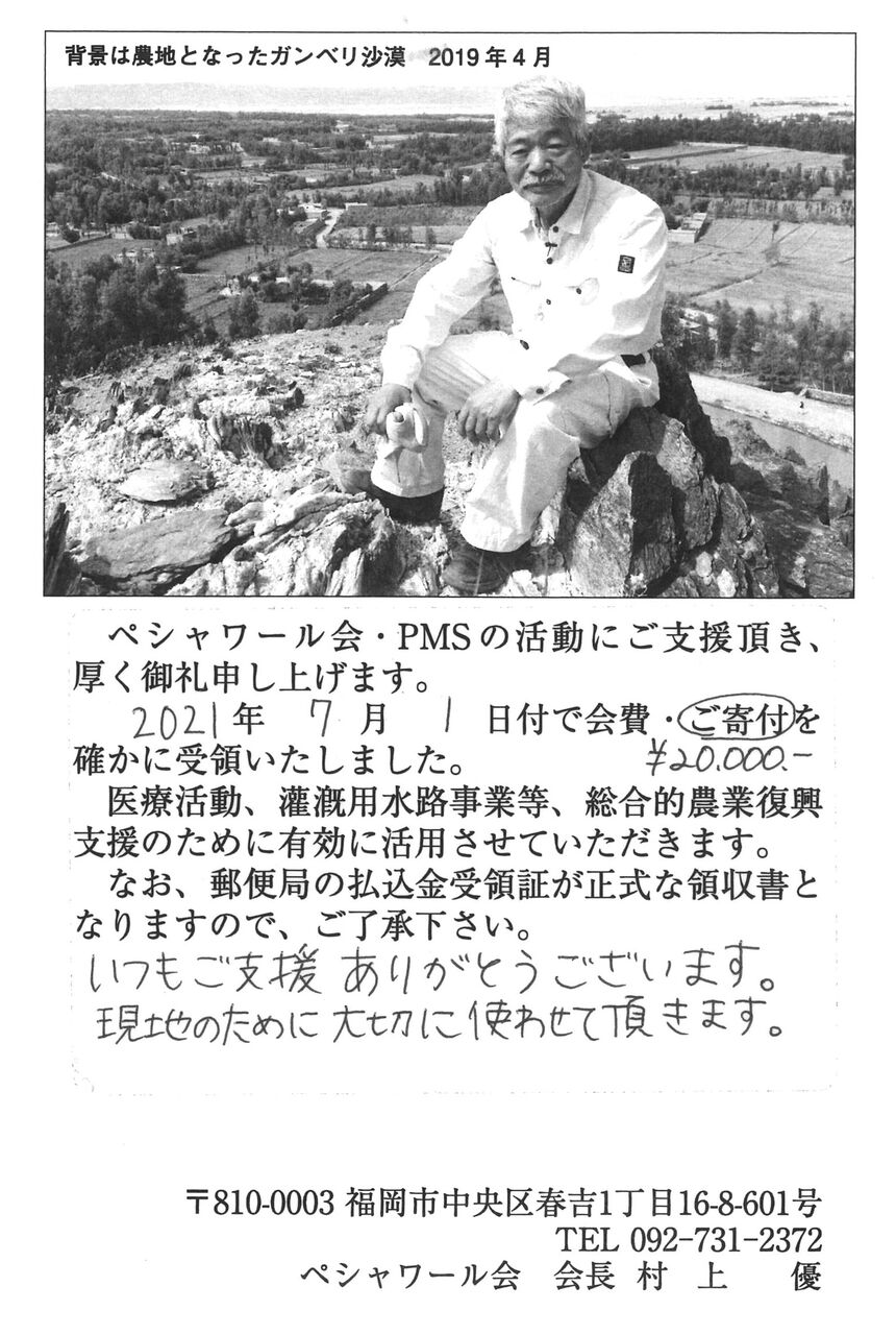 2002年以来、続けてきたときの忘れものの支援頒布会ですが、先月6月は1点が購入され代金20,000円全額をペシャワール会に送金いたしました。送金累計は、2021年7月1日現在で3,799,736円となりました。