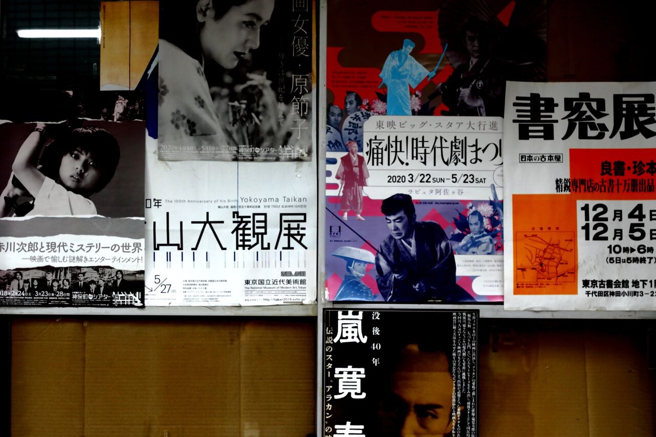 ph8 映画などのポスター。中央は片岡千恵蔵の机龍之介。神田神保町1。2021.06.22テラススクエア西端を右折すると神田神保町の書店街に通じる裏通りがある。書店街は竹橋の毎日新聞社から歩いて10分もかからない距離である。仕事が忙しくないときは、職場の同僚たちとこのあたりまで出かけて、昼食をとった。そのあと、本屋めぐりをするか、喫茶店でお茶を飲むとかするのである。