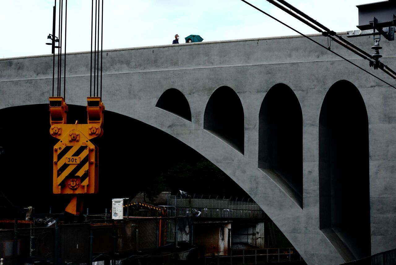 ph10 JR御茶ノ水駅からみた聖橋。神田駿河台4-5。2021.06.22駅のすぐ西側にお茶の水橋がある。橋の上に立つと、険しい断崖の下を神田川が流れている。下流方向を見ると、右手がJR御茶ノ水駅で、正面に聖橋が架かる。いまは残念なことに、御茶ノ水駅を改修するため、川の中央まで工事用桟橋が張り出しているが、近世と近代が混淆するここからの眺めは、私にとって東京の水辺を代表する名所の一つである。