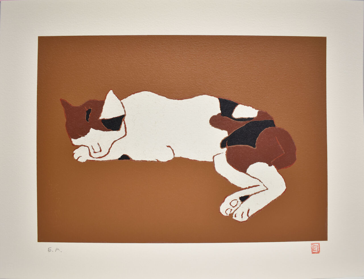 熊谷守一は76歳の時に脳卒中で倒れて以来、遠出が難しくなり、身近な植物、昆虫、猫を主題にすることが多くなっていきます。熊谷ときいて思い浮かぶ「明るい色調」や「赤い輪郭線」といった特徴的な作風は晩年のものです。今回の展示では、熊谷守一が生前に制作した版画と、没後にご遺族の監修により制作された版画、合わせて15点を展示します。