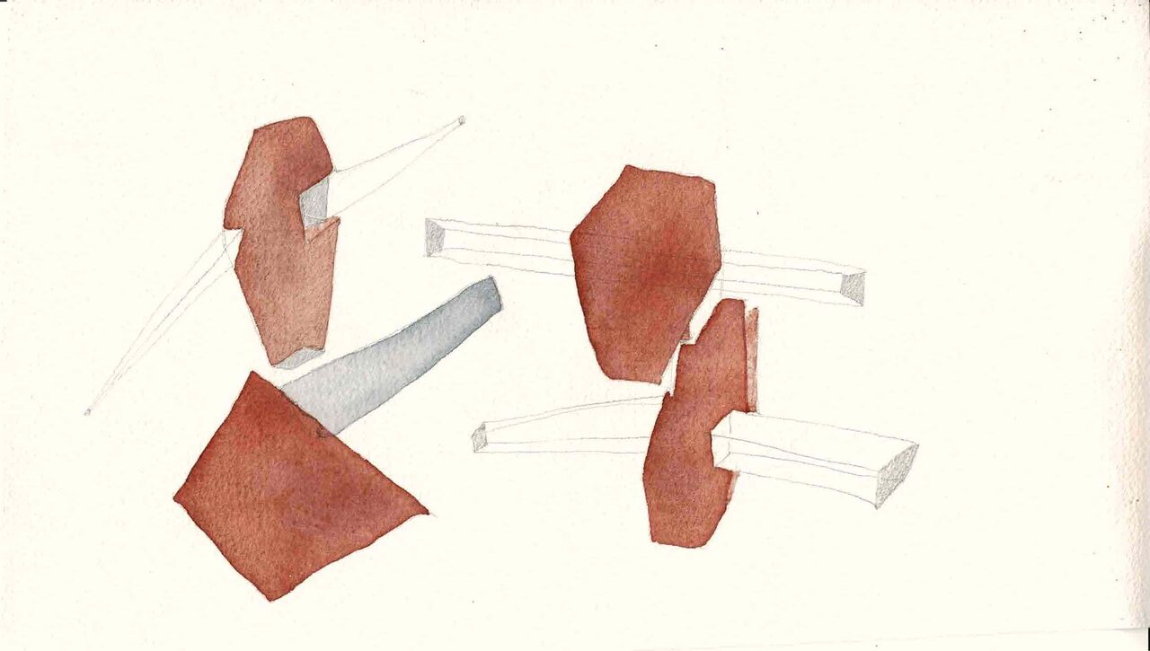 前回同様、木材の整えとドローイングの作業は同時に、交互にやっているが、以前は鉛筆と色鉛筆だけで描いていたドローイングに、今回は日本画に使う顔彩の彩色を入れてみている。彩色作業は筆の運びというよりはむしろ紙の上に落とした色の水滴の表面張力具合を調整する作業だ。今にも溢れ出しそうな水滴の塊にメスを入れるように筆を入れ、横にゆっくりと引き伸ばしていく。そして、時々思わぬ部分にはみ出したり、まだ乾ききっていない隣の彩色部に滲み出ていったりする。あー、あー、と自分の技量の拙さを痛感しながらも、そのはみ出た新たな彩色部の輪郭を頼りに、今度は鉛筆で新たな像を足していく。彩色と鉛筆の造形合戦が繰り広げられている。紙の上のとても小さな部分で。もちろん作業は一人でコツコツ、コソコソ(だいたいドローイングは夜中に描いている)とやるのだが、そんな造形合戦は決して孤独な気がしないのが面白い。やはり自分自身を超え出た外圧、外の存在がいることの安心感だろう。