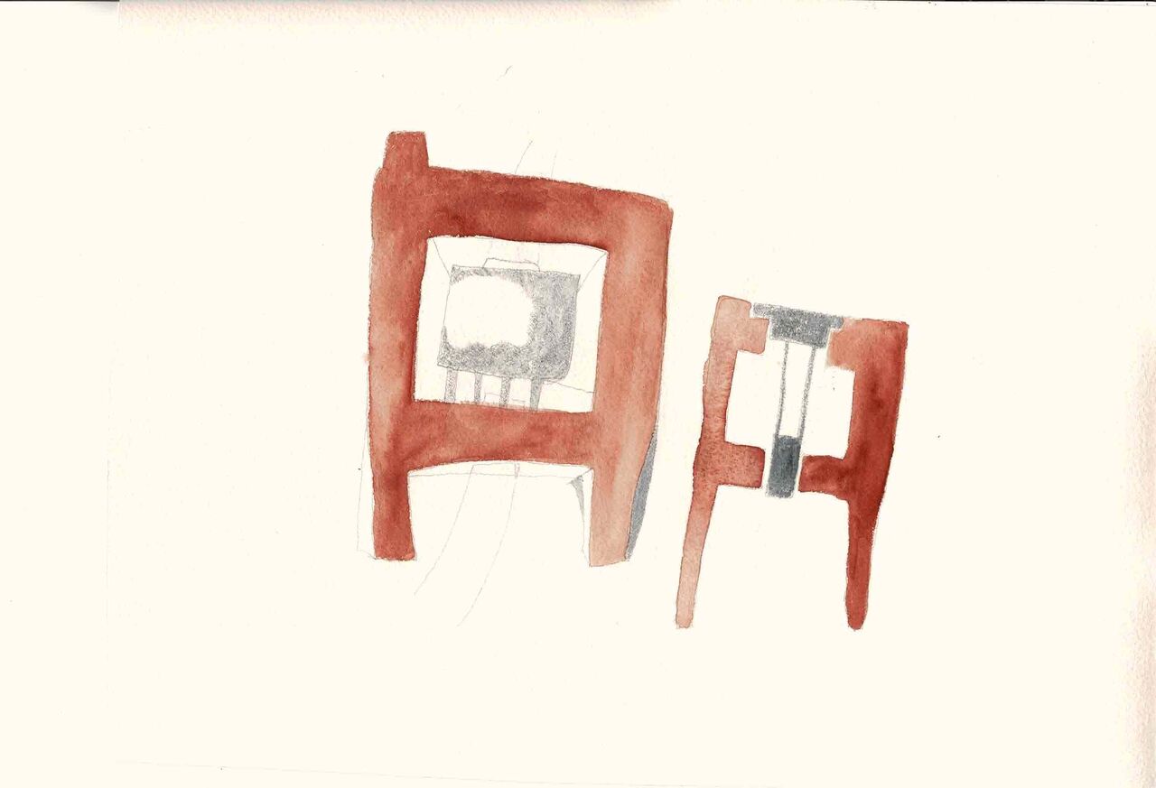 (制作途中2:鉛筆、顔彩、画用紙)外の存在がいることの安心感、というのは実は常日頃の生業としている建築の設計、あるいは家具の大きさくらいを考えるときにも重要としていることだ。やはり生業上、仕事相手である人のため、人間のために建築や家具を作っているのだが、その人にとって「外の存在がいる」ことが良いと感じられるその存在を作りたいと思っている。存在という言葉はなかなか小難しく、正確に言葉を操れているのか自分は怪しいが、存在が”いる”、モノが”いる”という状況を作ろうとしている。そんな微妙で繊細な形を目指して、妖怪についての論を書き記してみたり、渋沢栄一の言う民具について調べてみたり、はたまた”カワイイ”という言葉について考え込んでみたり頭で色々とこねくり回し、今も引き続き悩んでいる。しかし、つまるところ、微妙な、としか言いようのないその感覚を生み出すには、造形に工夫を加え続けるしかない、というのが今の自分なりの決着点である。それを画用紙の上でも試みている。