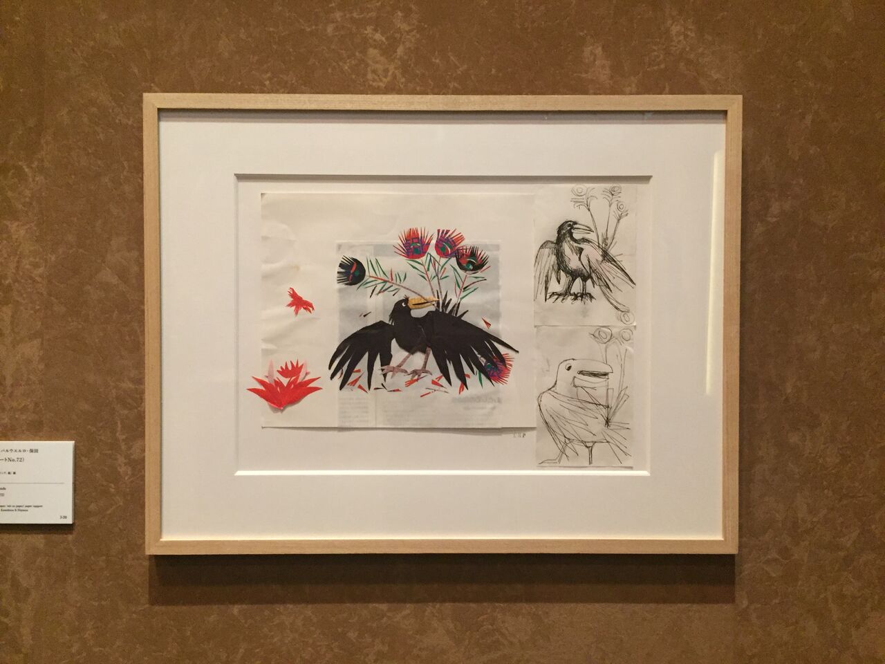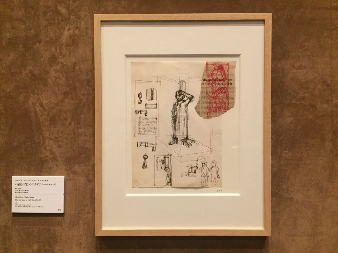 地下3階の吹き抜けのある展示室のシルヴィア・ミニオ=パルウエルロ・保田は、夫の祖国である日本に移住し、育児中心の生活で、素描、彫刻、絵画に取り組みました。《地獄の門》のアイデア(シートNo.19)は、一部に額と口元をおさえた人物が描かれ、一部に新聞紙がコラージュされています。新聞記事には、1987年夏に沖縄で開かれた国体に現天皇(当時浩宮)が訪れ、その際に警察が沖縄の住民に方言を使わないよう要請した可能性が書かれていました。(*3)祖国の言葉が通じない異国での暮らしの不自由さを、同じく話す言葉の自由を奪われた沖縄の人に重ねたのかもしれません。祈りや信仰がテーマのドローイングが多く並ぶ中、絵本の中から飛び出してきたようなカラスは、羽を伸ばして生き生きしていました。