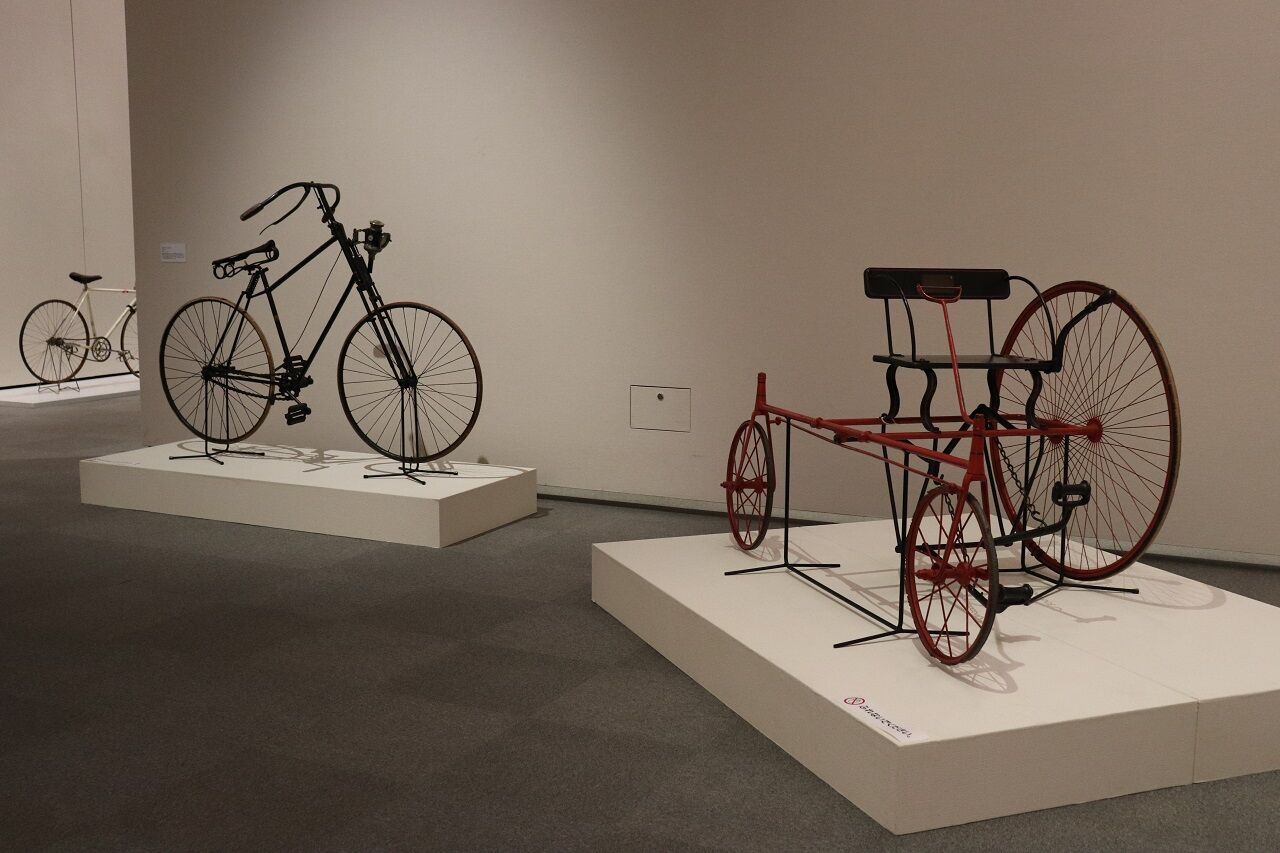 また、20世紀のアヴァンギャルド芸術に登場する自転車と言えば、デュシャンの〈自転車の車輪〉(1913年)や、ピカソの〈雄牛の頭〉(1942年)を思い浮かべる(ともに本展には未出品)。両作品とも、自転車の実用性から切り離されたオブジェである。ただし、私見だが、これらは自転車という工業製品・機械の形態への関心をぬぐい切れず、全きオブジェとはなりきれていないように思える。これは自転車の形態が持つ造形の魅力のあらわれだろうか。今回は150年前のクラシック自転車から最新型まで、19台の自転車を展示している。機械美、機能美という面からも自転車を味わってみてはいかがだろう。